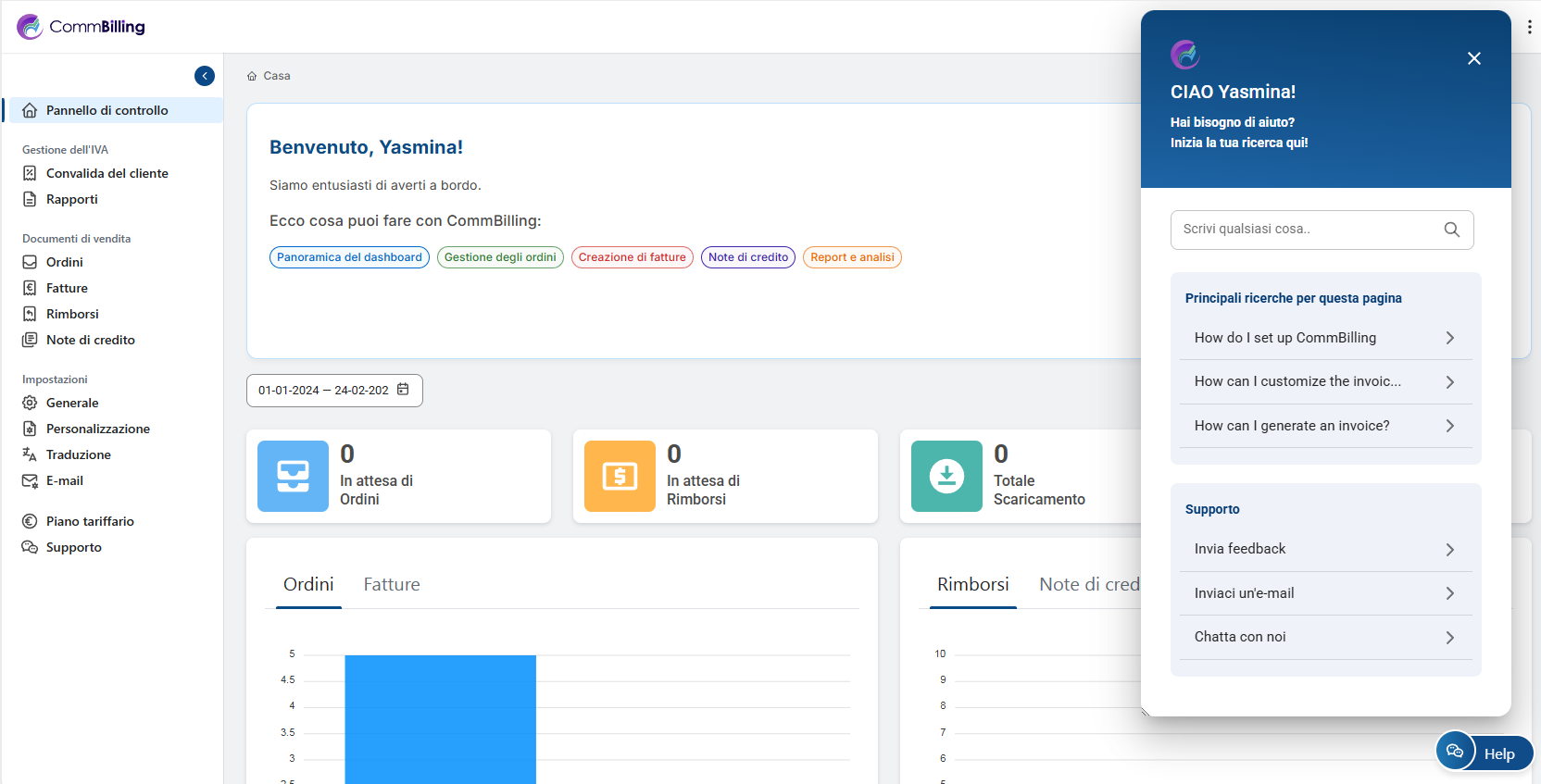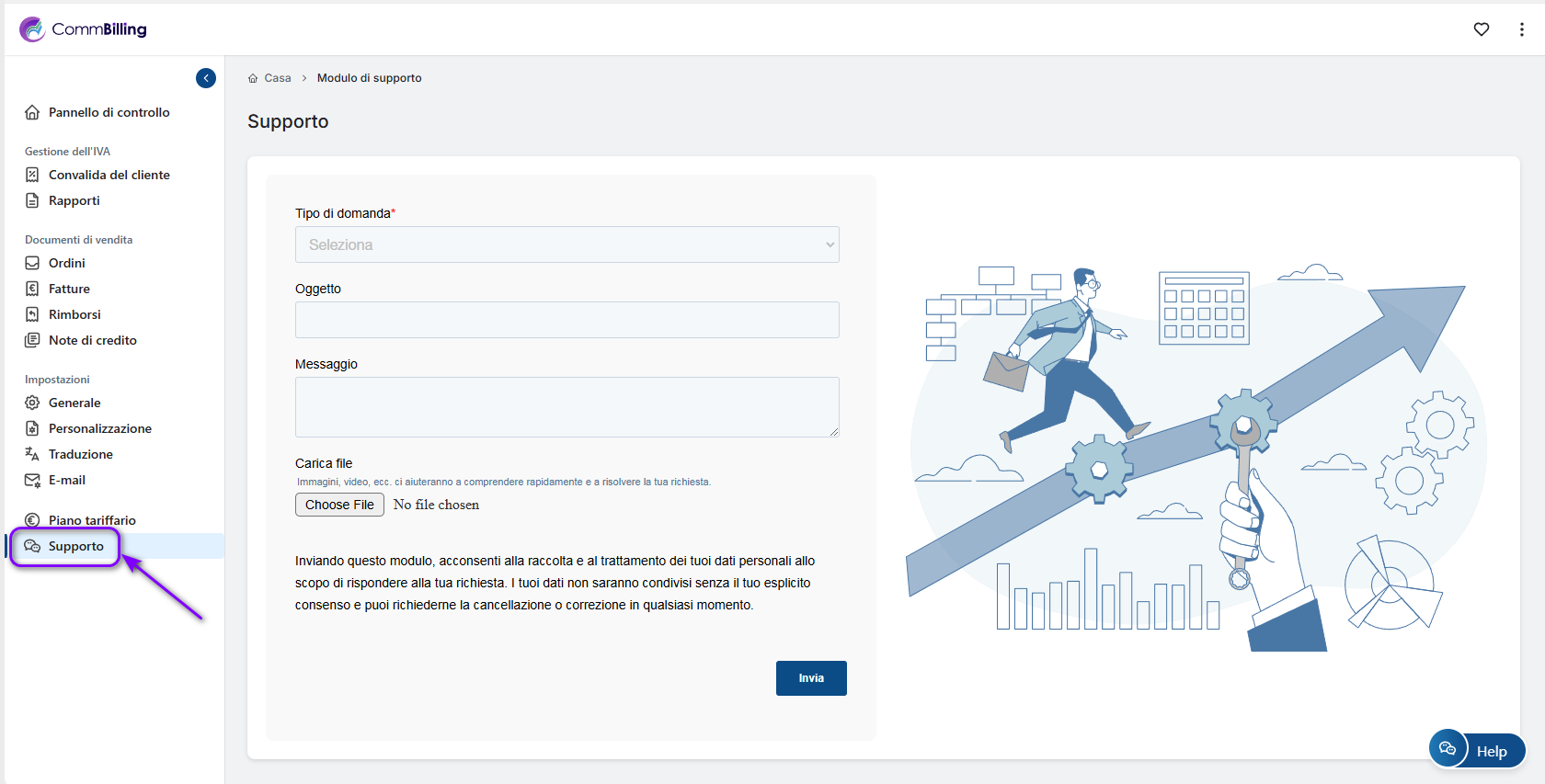 La scheda Assistenza di CommBilling offre agli utenti un modo semplice per contattare direttamente il team di assistenza. Sia che abbiate bisogno di aiuto per la risoluzione di un problema o che vogliate fornire un feedback, questa sezione è stata progettata per rendere l'assistenza semplice ed efficiente.