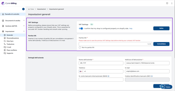 In questa sezione è possibile inserire e convalidare il numero di partita IVA del negozio. CommBilling controlla automaticamente la validità del numero di partita IVA per garantire che l'azienda sia conforme alle normative IVA dell'UE.