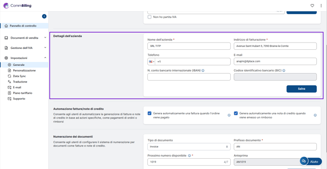 La scheda Impostazioni generali di CommBilling è suddivisa in quattro sezioni chiave che aiutano a gestire i dettagli dell'azienda e a semplificare i processi di fatturazione: