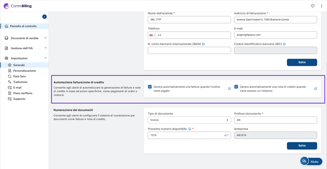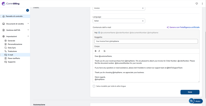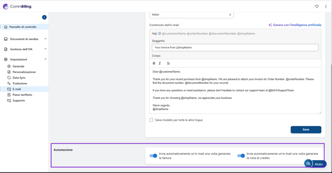 - Genera automaticamente le fatture: Se attivata, CommBilling creerà automaticamente le fatture per ogni ordine effettuato nel vostro negozio Shopify.