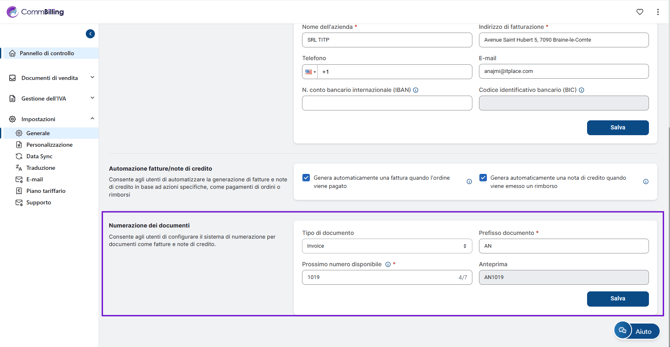 Questa sezione consente di configurare il sistema di numerazione per documenti come fatture e note di credito. Una sequenza di numerazione chiara e personalizzabile garantisce la coerenza e aiuta l'organizzazione e la tracciabilità dei documenti.