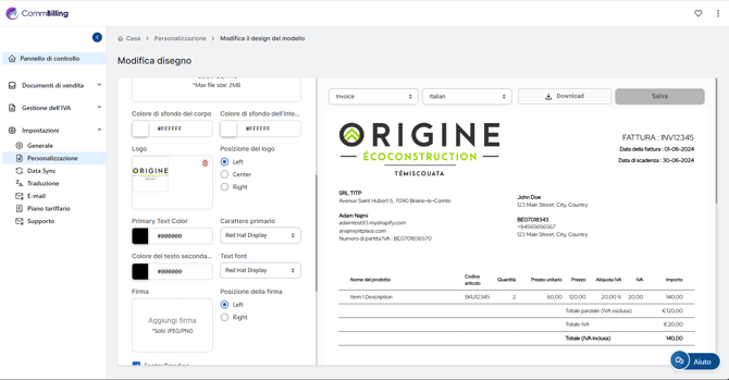- Progettazione dei documenti di vendita: In base al vostro piano di abbonamento, potete personalizzare completamente o meno il design delle fatture e delle note di credito, aggiungendo il logo del vostro negozio, scegliendo schemi di colori e aggiungendo informazioni aggiuntive come termini e condizioni, rimuovendo il marchio CommBilling, ecc.