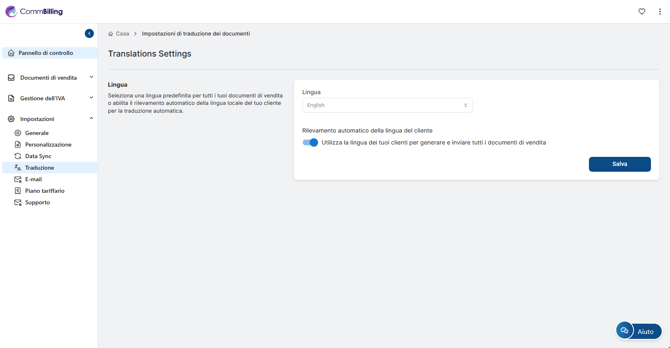 Nella sotto-tabella Traduzione, CommBilling rileva la lingua utilizzata nel negozio Shopify e regola l'interfaccia di conseguenza. Se necessario, è possibile modificare manualmente le impostazioni della lingua.