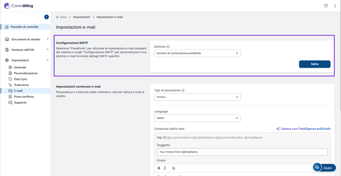 - Configurazione SMTP: A seconda del piano, è possibile utilizzare il server SMTP di CommBilling o configurarne uno proprio, per avere il controllo sulle modalità di invio di fatture, note di credito e altre comunicazioni.