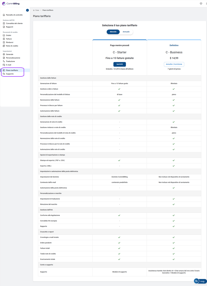 La scheda Piano tariffario di CommBilling fornisce una ripartizione dettagliata delle funzionalità disponibili in ciascun piano di abbonamento: C-Starter e C-Business. Questa sezione è stata pensata per aiutarvi a confrontare i piani, a gestire il vostro abbonamento e ad apportare le modifiche necessarie.