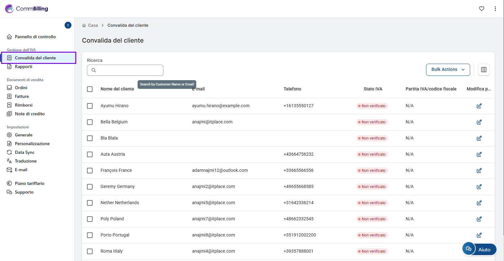 Questa sezione è progettata per semplificare la gestione delle informazioni IVA dei clienti. Puoi aggiungere o modificare manualmente i dati IVA per ogni cliente e con un semplice clic CommBilling verificherà automaticamente la partita IVA. Il sistema confermerà se il numero è valido aiutandoti a garantire accuratezza e conformità.