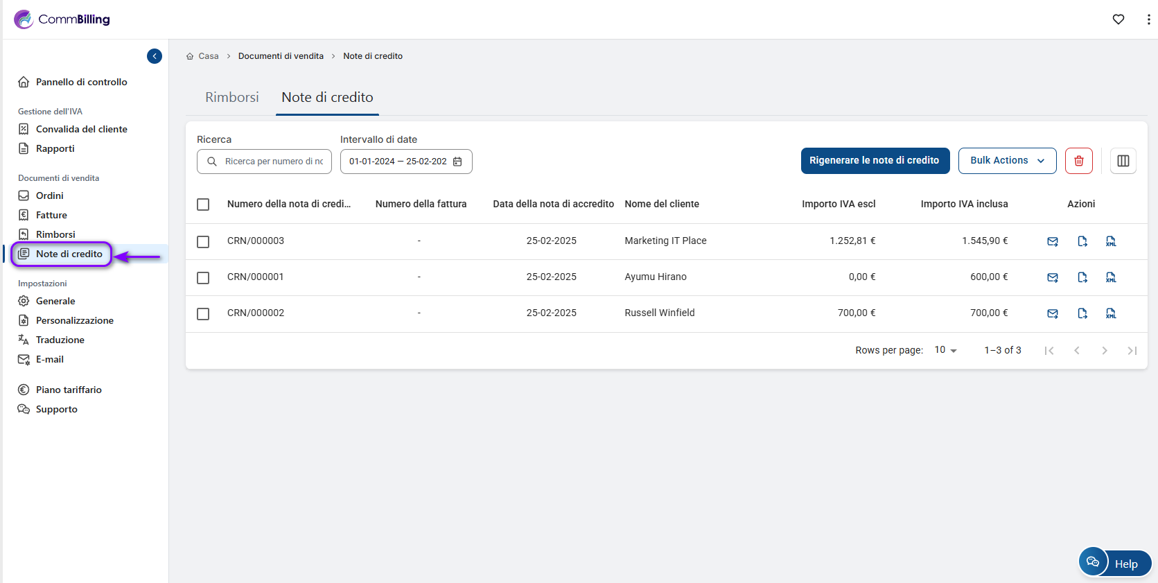 Esporta CSV: Esporta i dettagli della nota di credito in un file CSV.