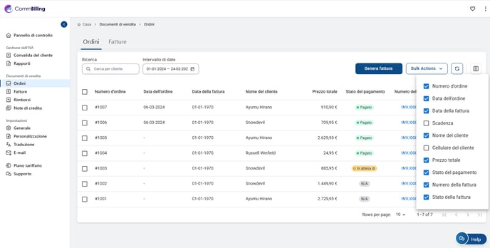 Come nella scheda Ordini, è possibile visualizzare altre colonne, come la Data fattura, per una panoramica più dettagliata.