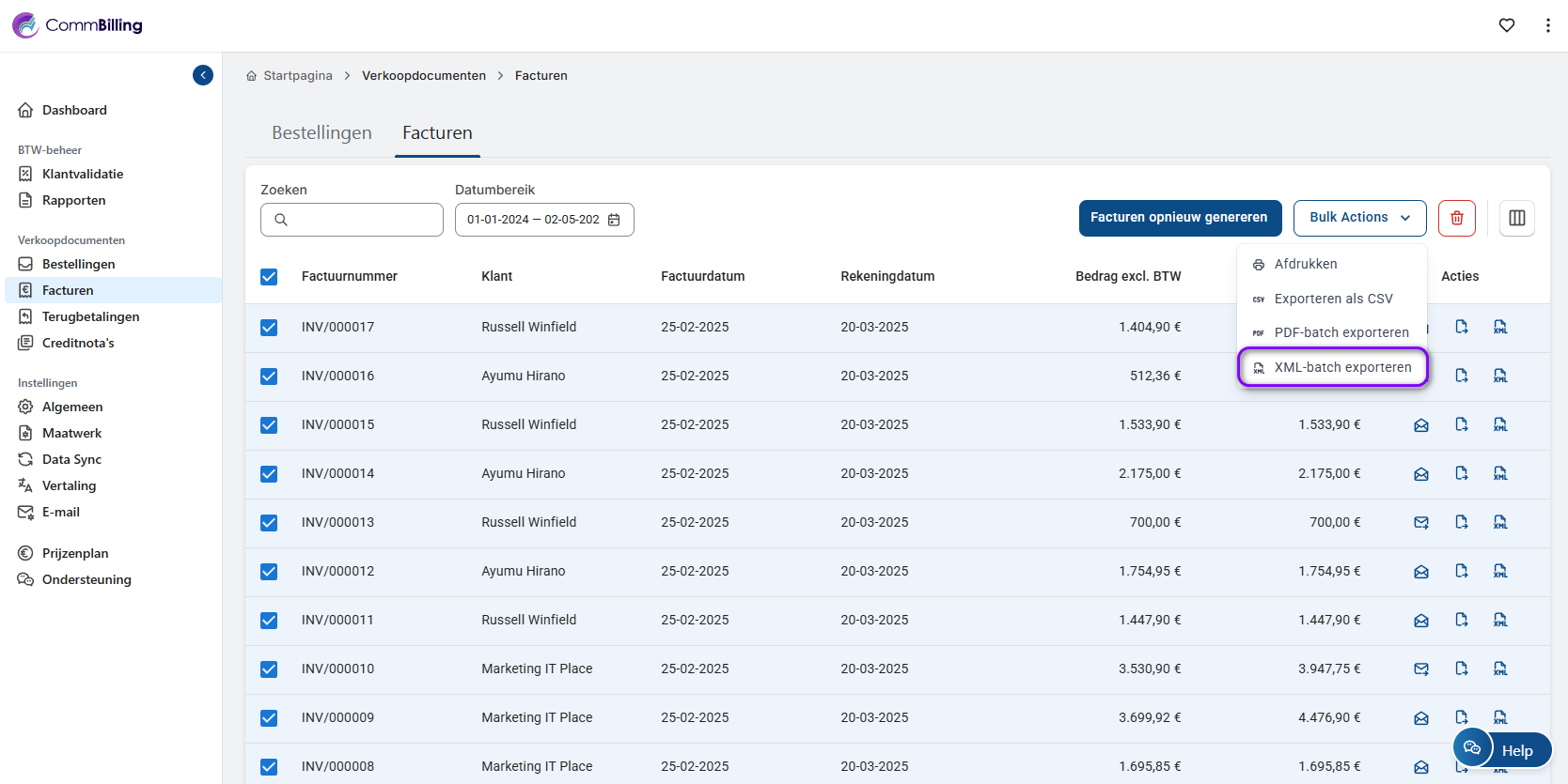 Het exporteren van facturen als XML is een krachtige functie voor bedrijven die factuurgegevens in andere systemen moeten integreren of aan specifieke wettelijke vereisten moeten voldoen. Deze functie is exclusief beschikbaar voor gebruikers van het C-Business Plan. XML-bestanden bieden een gestructureerd formaat dat eenvoudig in boekhoud- of financiële software kan worden geïmporteerd. Hier leest u hoe u uw facturen in XML-batchformaat kunt exporteren: