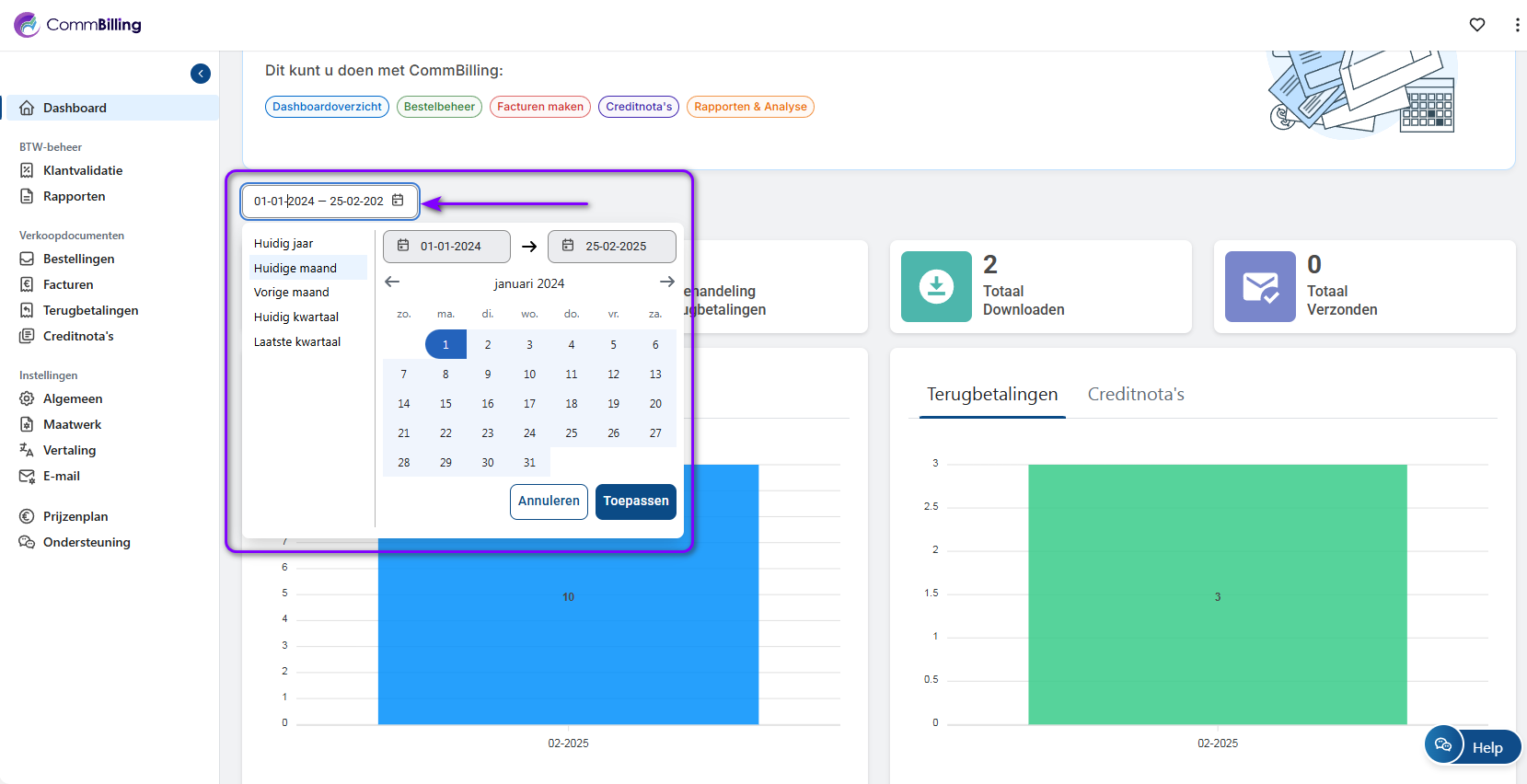 1. Navigeer vanuit het linkermenu van CommBilling naar het Dashboard.