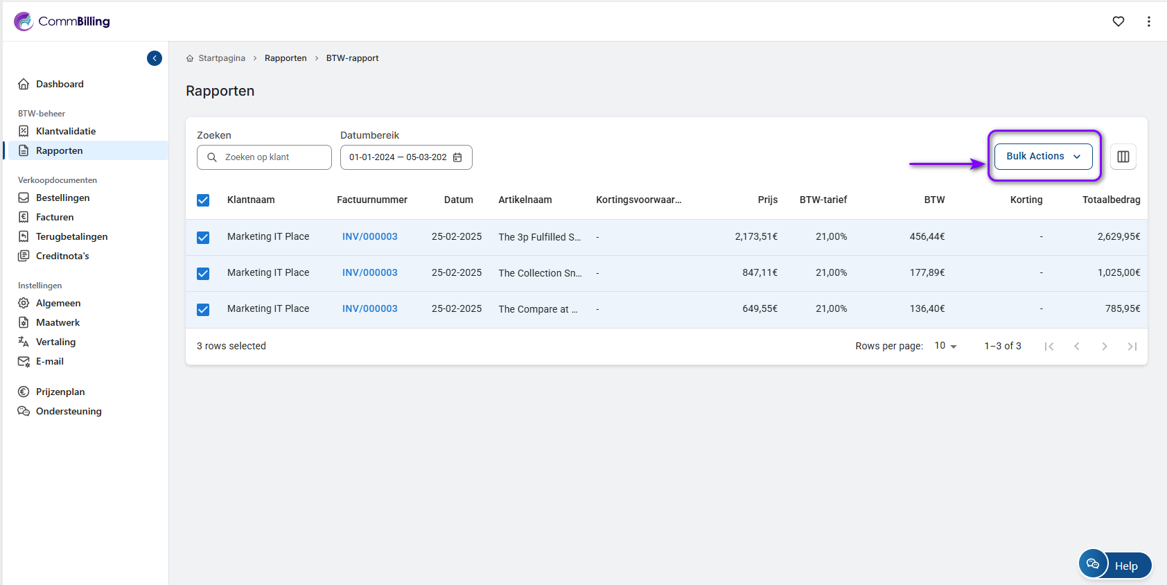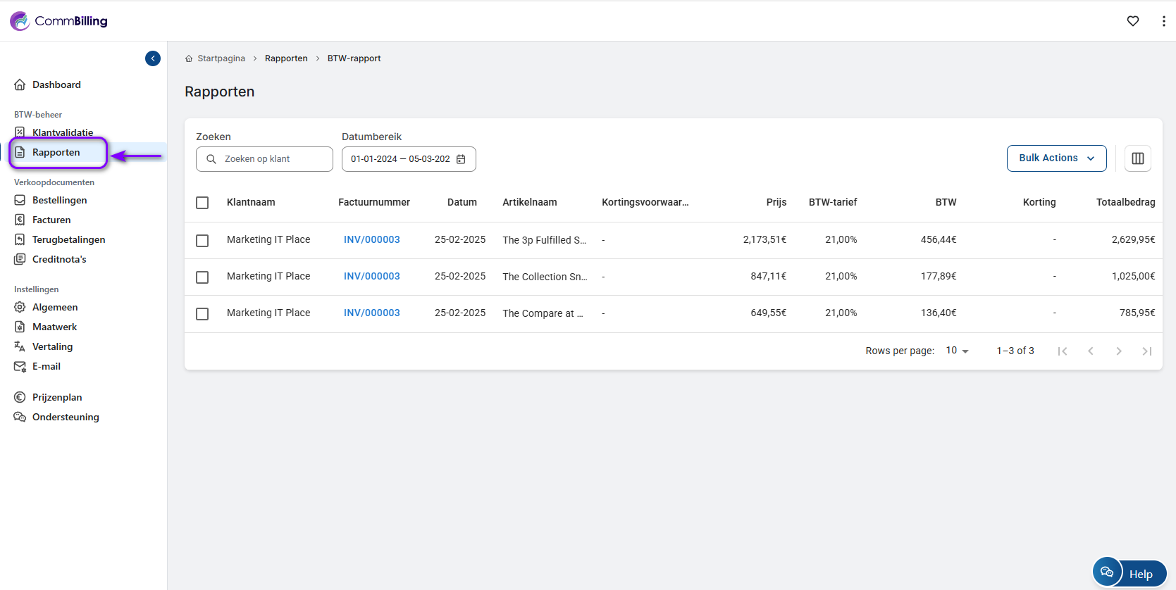 In CommBilling bieden belastingrapporten een georganiseerd overzicht van alle bestellingen en facturen, samen met de btw die per land wordt toegepast. Met filteropties en bulkacties kunt u eenvoudig rapporten aanpassen en exporteren, waardoor het eenvoudiger wordt om financiële rapportage te beheren en aan uw belastingverplichtingen te voldoen.