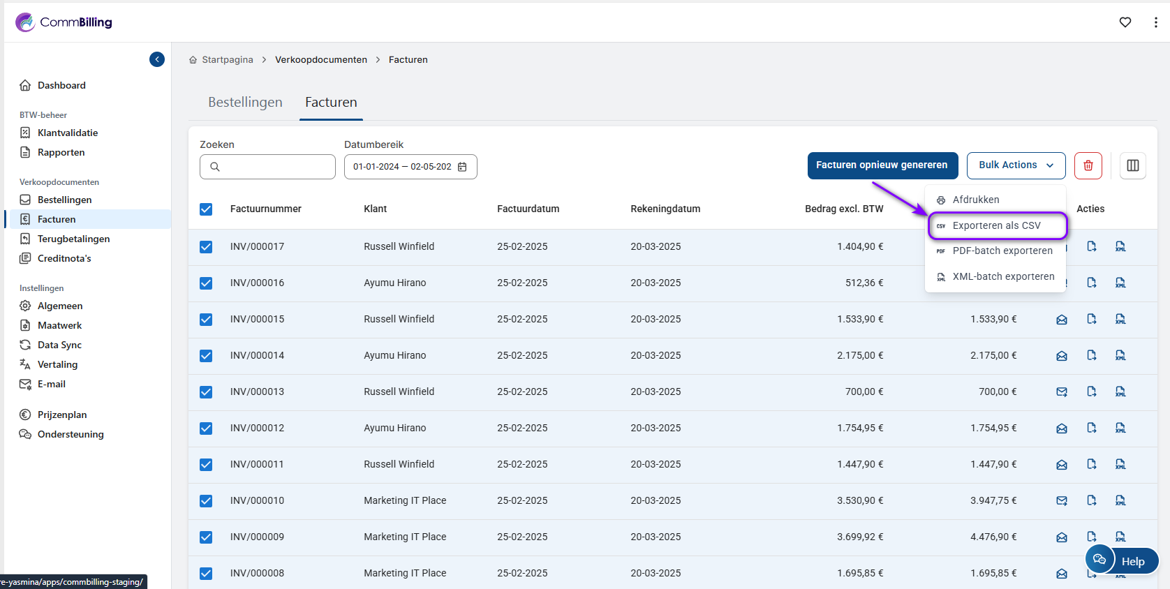CommBilling genereert en downloadt automatisch een CSV-bestand met de geselecteerde facturen.