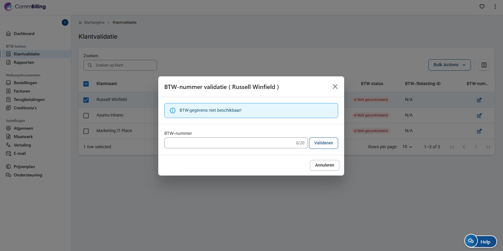 2. Klik op de knop Valideren. CommBilling controleert en valideert automatisch het btw-nummer bij het Europese btw-systeem.