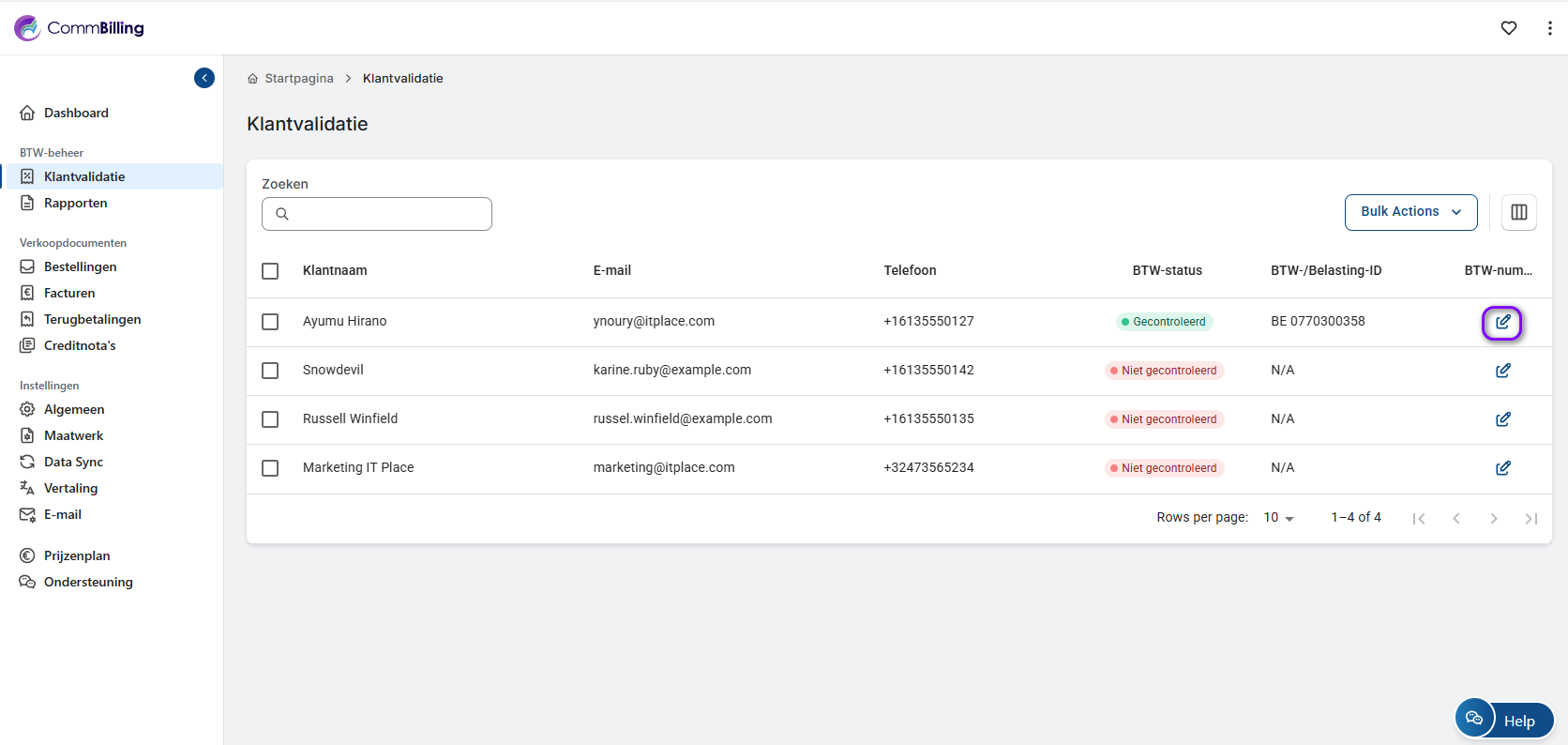 2. Zoek de klant voor wie u het btw-nummer wilt toevoegen of valideren. Klik op het potlood (bewerkingspictogram) naast het btw-veld van de klant.
