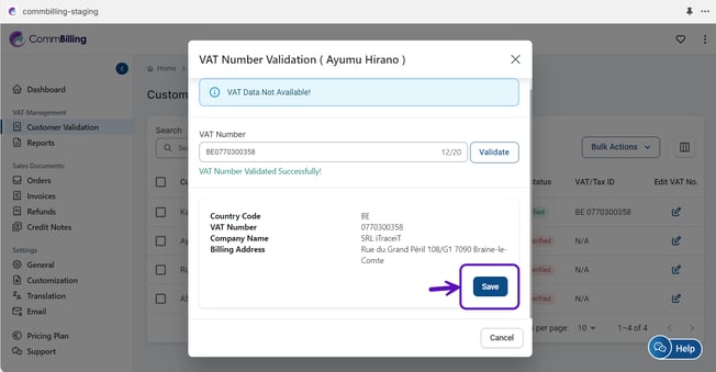 3. Zodra het btw-nummer succesvol is gevalideerd, klikt u op de knop Opslaan.