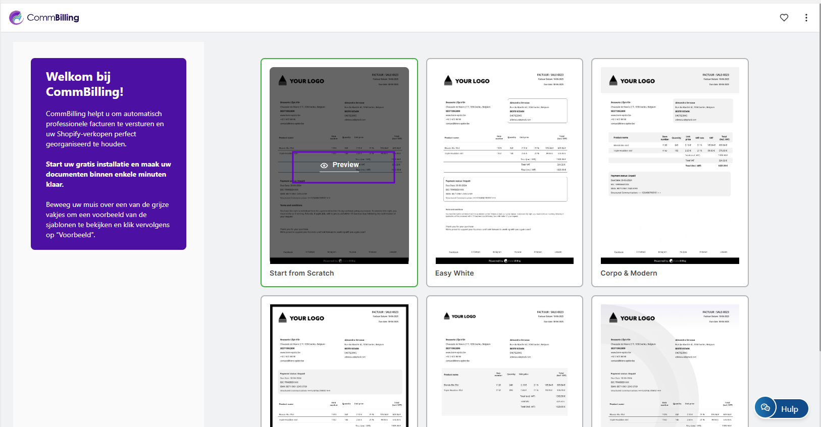 Na het installeren van CommBilling vanuit de Shopify App Store wordt u door een snelle installatieprocedure geleid. Deze onboarding helpt u de basisinstellingen te configureren die nodig zijn om de app onmiddellijk te gebruiken.