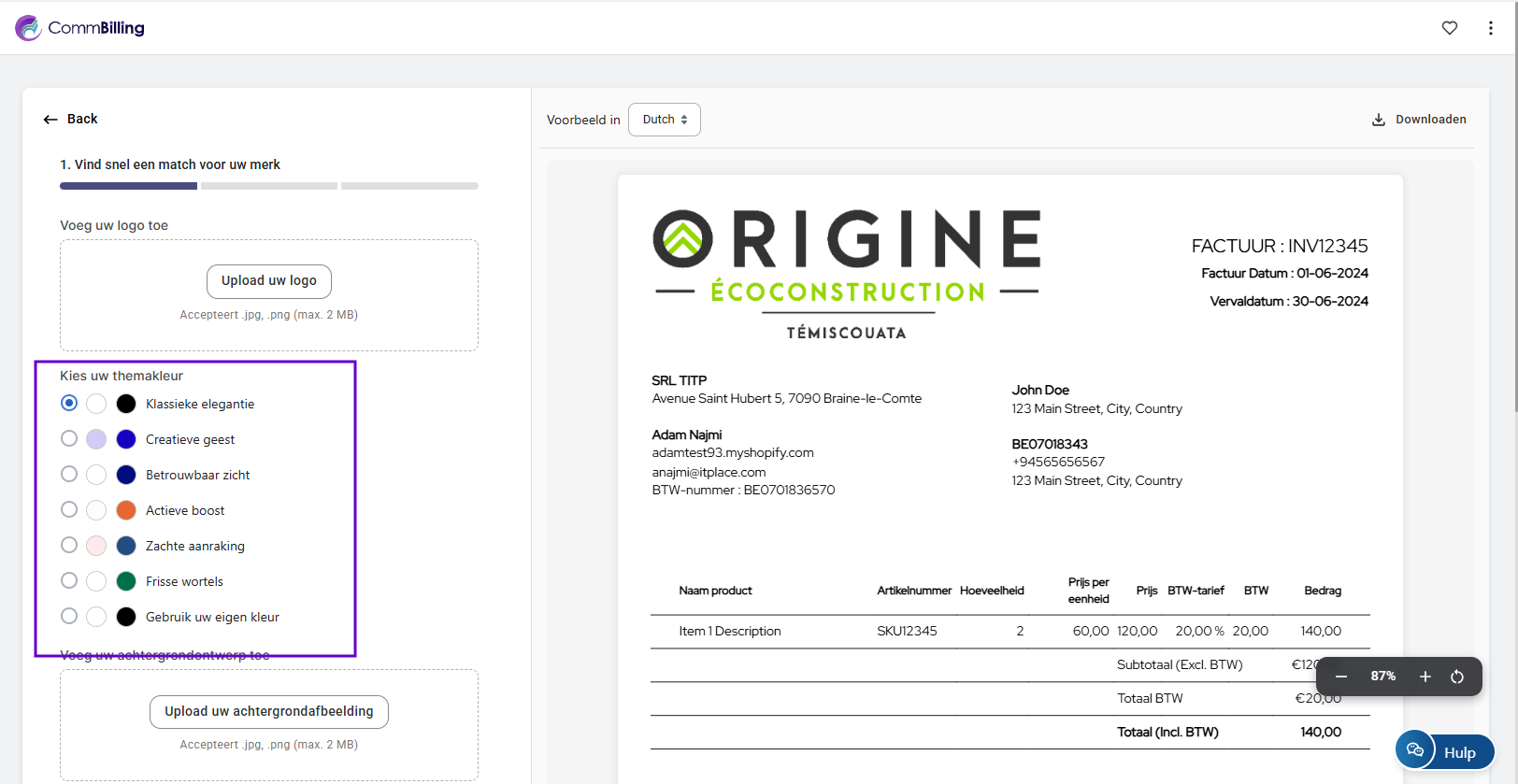 - Stap 1: Upload het logo van uw bedrijf, kies uw themakleur en klik op Volgende.