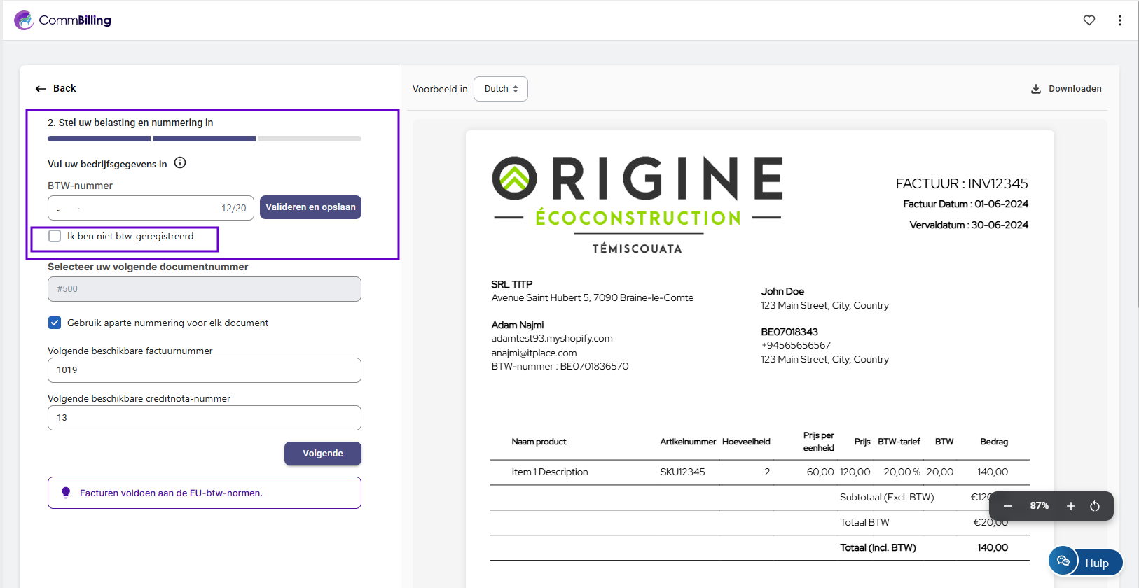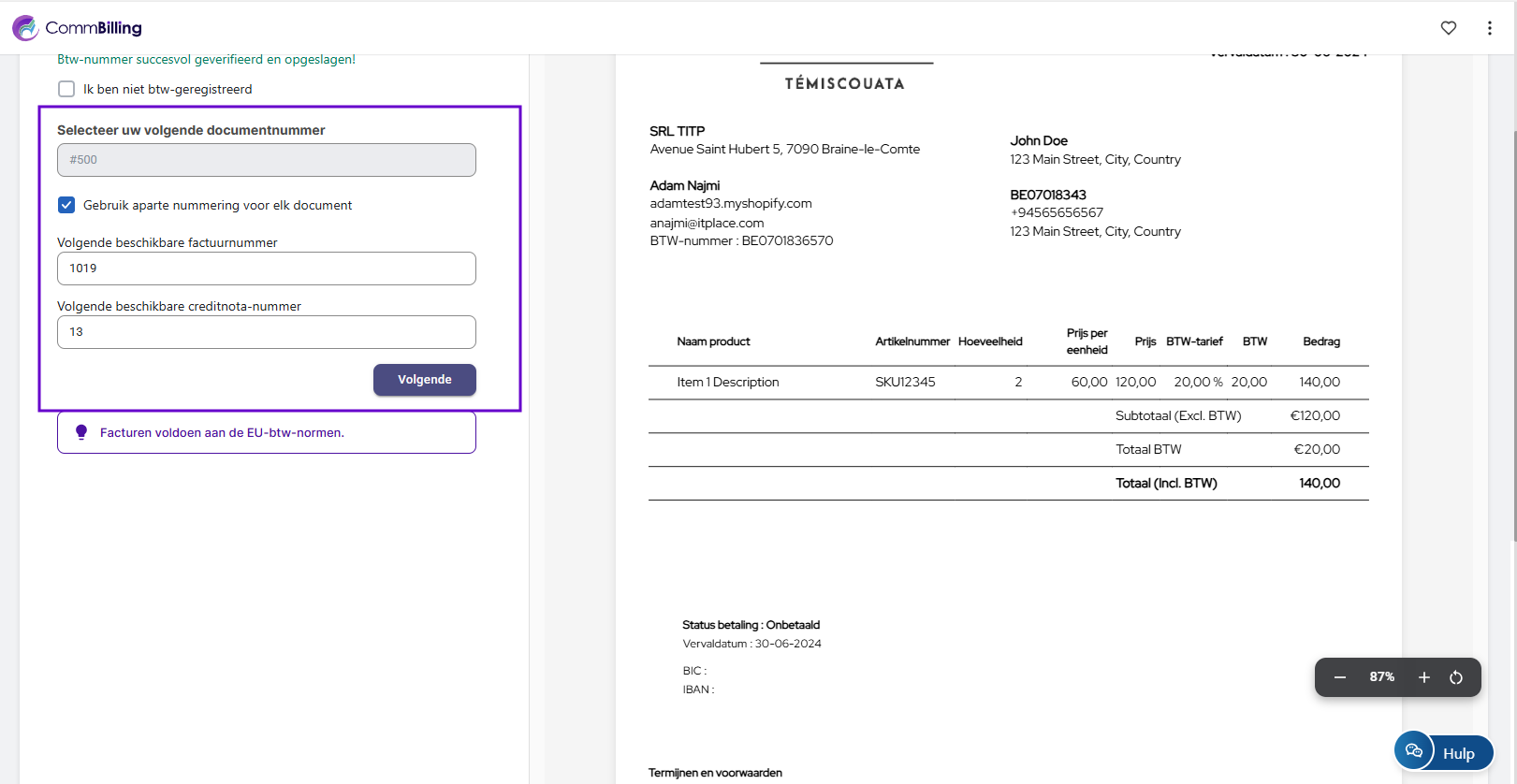 Het correct instellen van CommBilling zorgt voor een nauwkeurige btw verwerking, een soepele synchronisatie van bestellingen, conforme facturatie en een volledig geautomatiseerde factureringsworkflow. Deze eerste configuratie is essentieel om ervoor te zorgen dat uw verkoopdocumenten, automatiseringsregels en ontwerpvoorkeuren naadloos samenwerken met uw Shopify winkel.