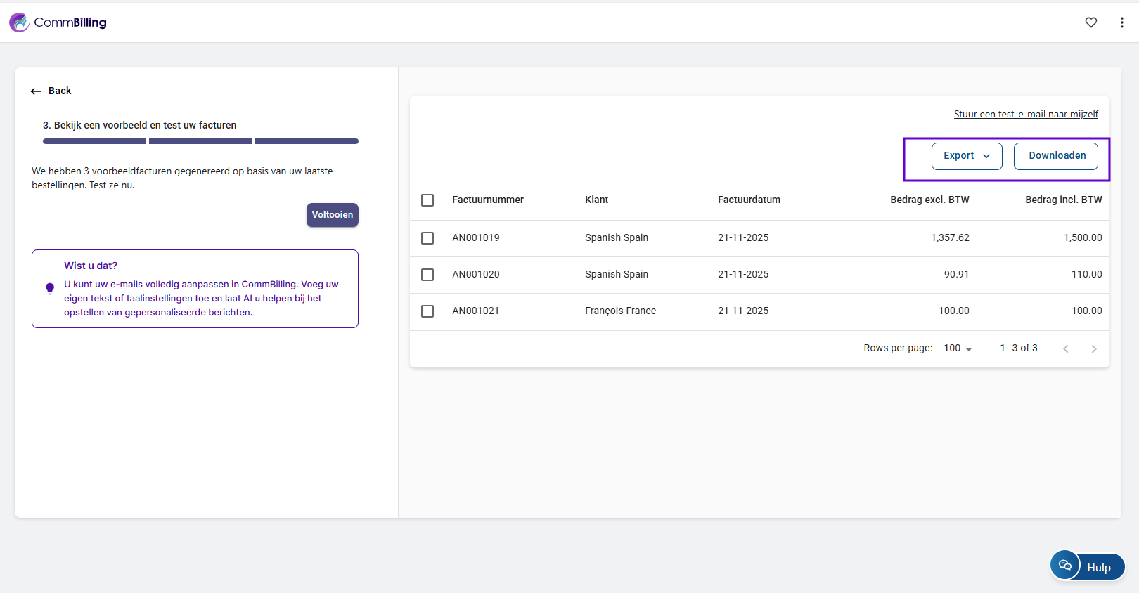 Uw snelle installatie is nu voltooid en uw factureringsapp is klaar voor gebruik. U kunt nu beginnen met het genereren van facturen met het extra voordeel dat CommBilling automatisch drie facturen gratis genereert als onderdeel van uw onboardingervaring. Verdere aanpassingen kunnen op elk moment worden gedaan in het tabblad Instellingen.