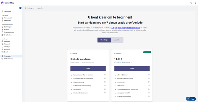 Het prijstabblad is uw centrale plaats om uw abonnement te kiezen en te beheren. Met een gratis proefperiode van zeven dagen voor beide plannen kunt u CommBilling met vertrouwen verkennen en het plan kiezen dat uw facturatieproces en bedrijfsontwikkeling het beste ondersteunt.