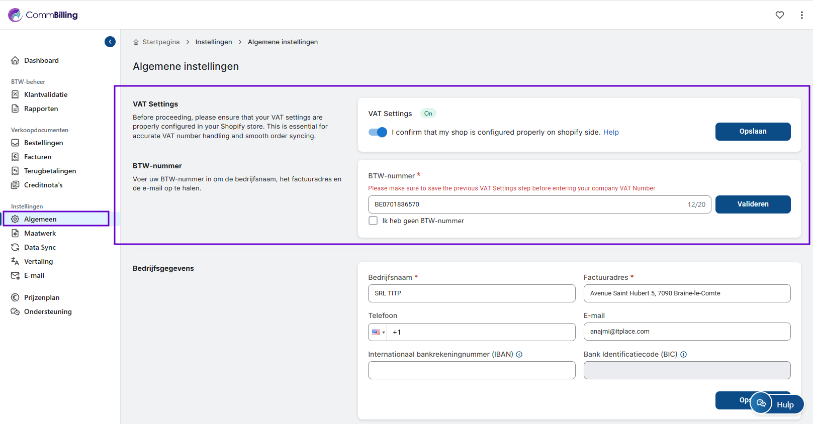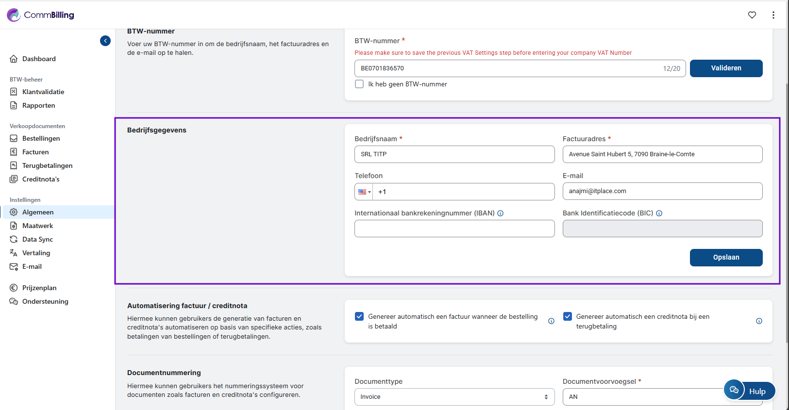 Het configureren van uw Algemene instellingen is een essentiële stap om naleving nauwkeurigheid en operationele efficiëntie te waarborgen. Wanneer deze instelling is voltooid kan CommBilling uw bestellingen correct synchroniseren btwinformatie valideren en consistente gegevens toepassen op alle verkoopdocumenten. Deze basis zorgt vanaf het begin voor een soepele en professionele facturatie ervaring.