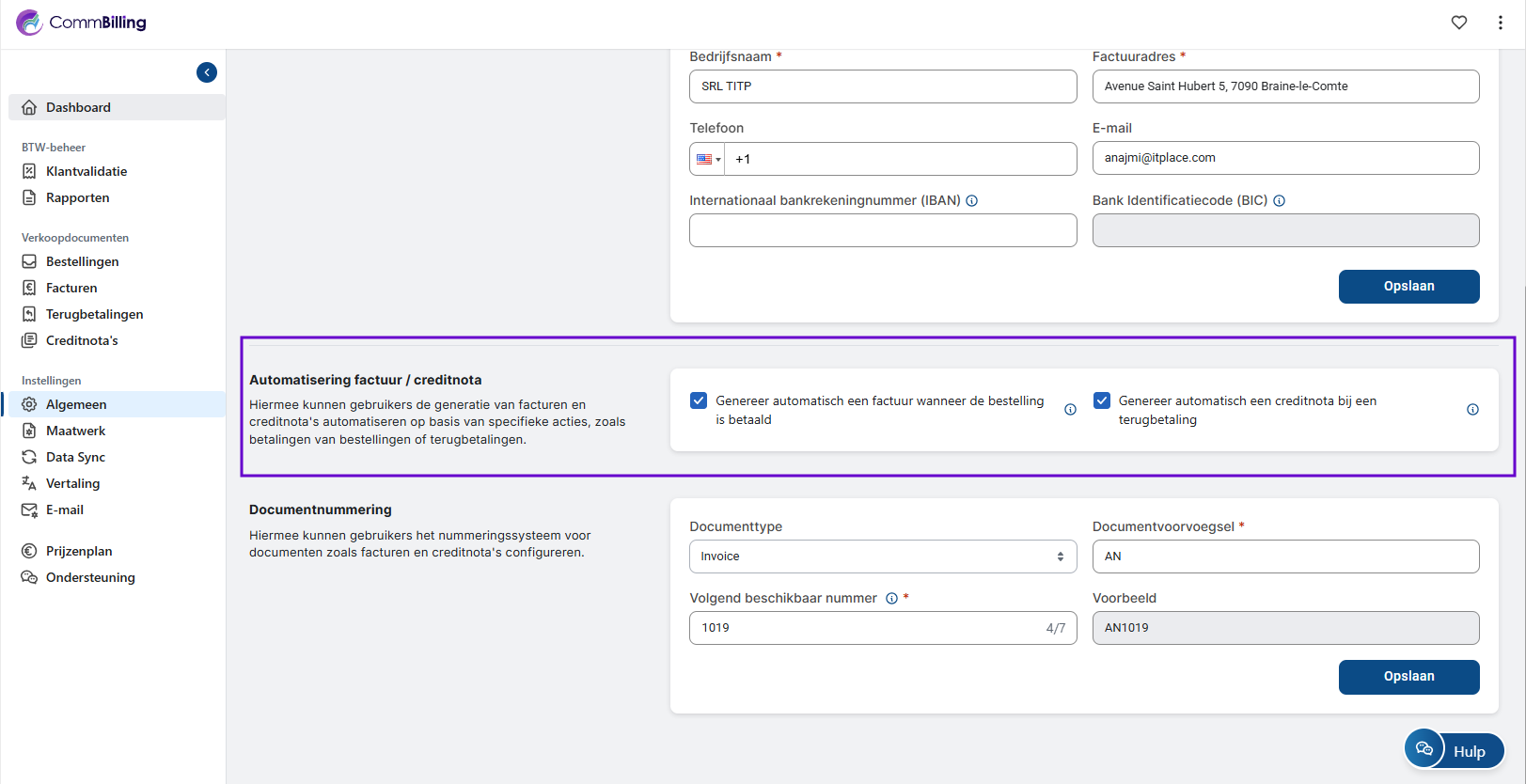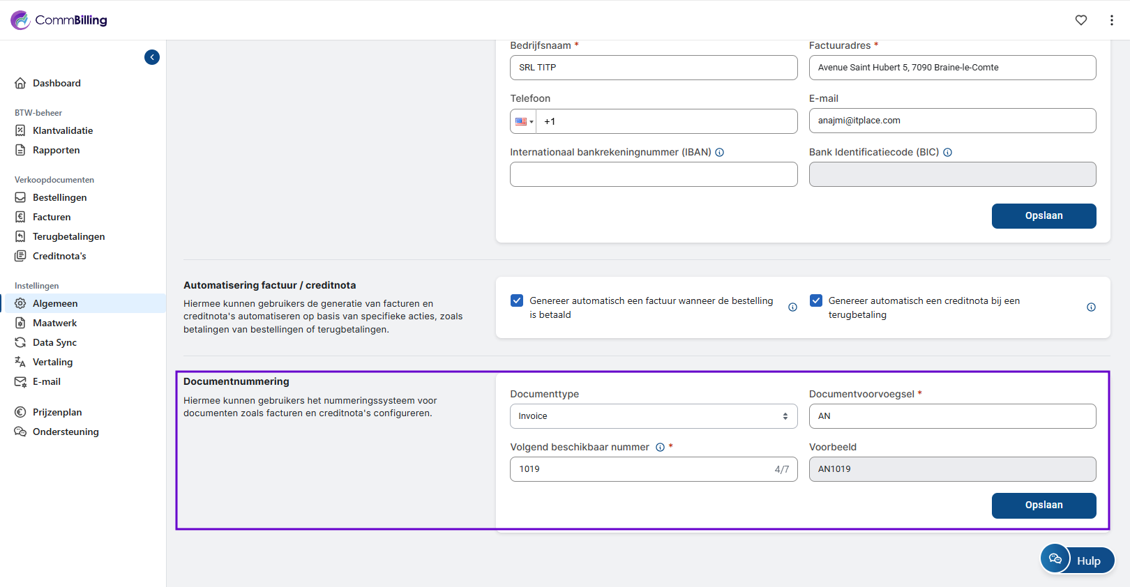 De sectie Algemene instellingen vormt de basis van uw CommBilling configuratie. Het zorgt ervoor dat uw bedrijfsgegevens btw validatie documentnummering en automatiseringsregels correct zijn ingesteld voordat u begint met het genereren van facturen of creditnota s. Een correcte configuratie in deze sectie garandeert nauwkeurigheid naleving en een soepele dagelijkse werking.