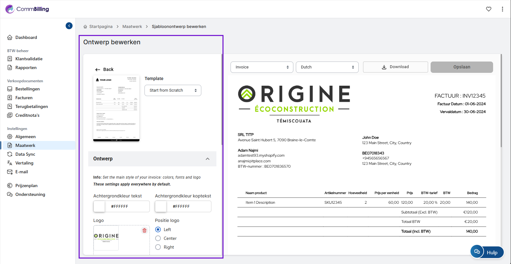 Door uw verkoopdocumenten in CommBilling aan te passen, zorgt u ervoor dat elke factuur, creditnota of terugbetaling de professionaliteit en branding van uw bedrijf weerspiegelt. Deze flexibiliteit helpt u duidelijke, consistente en goed ontworpen documenten te leveren die uw communicatie met klanten versterken.