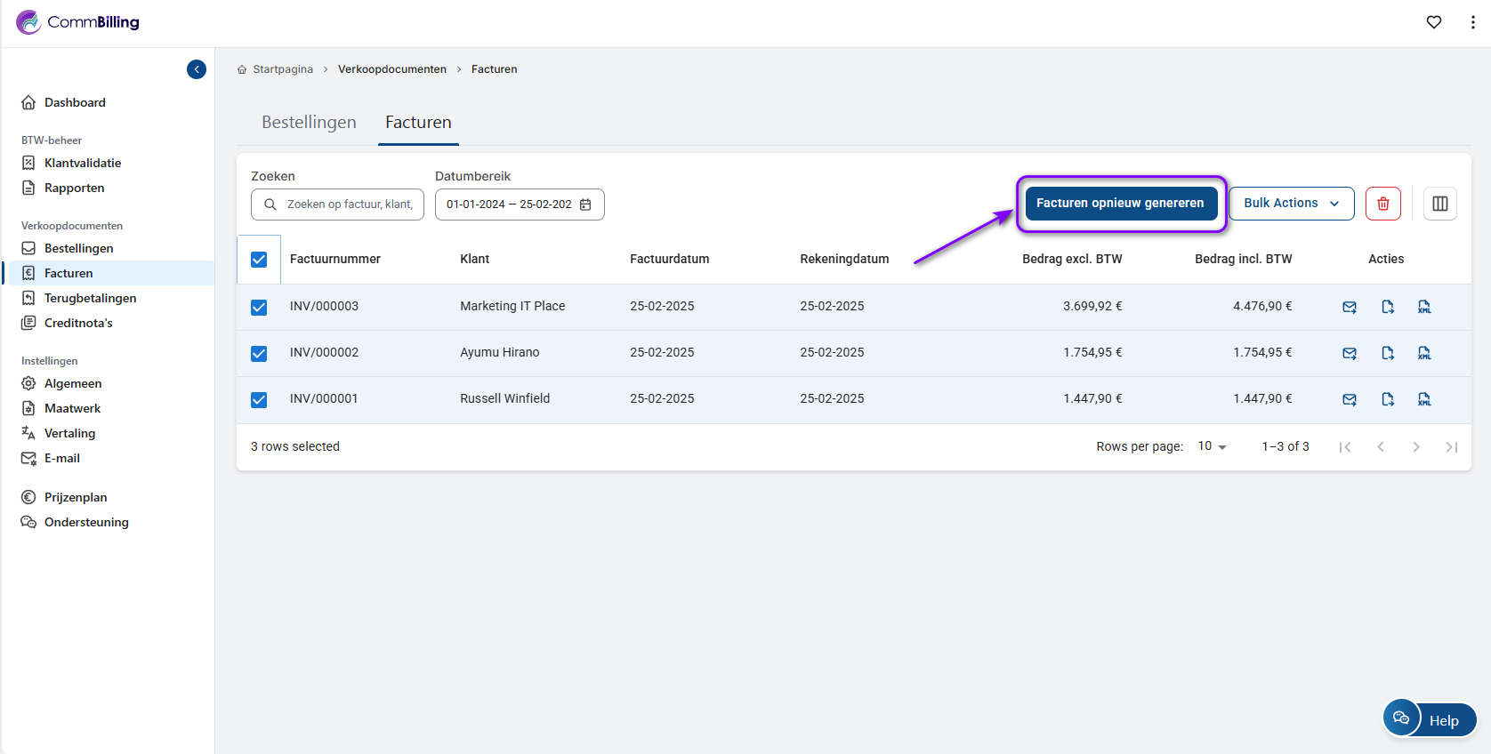 2. Selecteer de factuur(en) die u opnieuw wilt genereren uit de lijst.