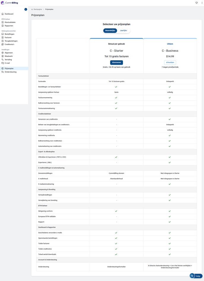 Welke functies zijn inbegrepen in het C-Starter-plan van CommBilling?