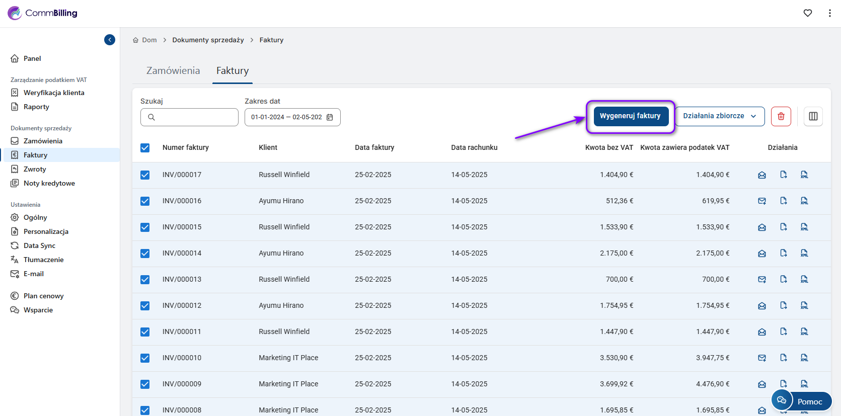 2. Wybierz z listy fakturę (faktury), którą chcesz ponownie wygenerować.