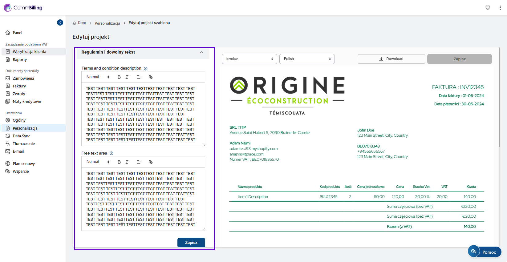 W CommBilling możesz łatwo dodawać i edytować te notatki aby twoje faktury były bardziej informacyjne zgodne z przepisami i dopasowane do stylu komunikacji twojej firmy.
