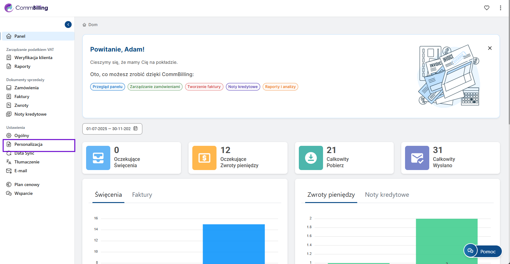 - Krok 1: Przejdź do sekcji Ustawienia w CommBilling i wybierz z menu zakładkę Personalizacja.