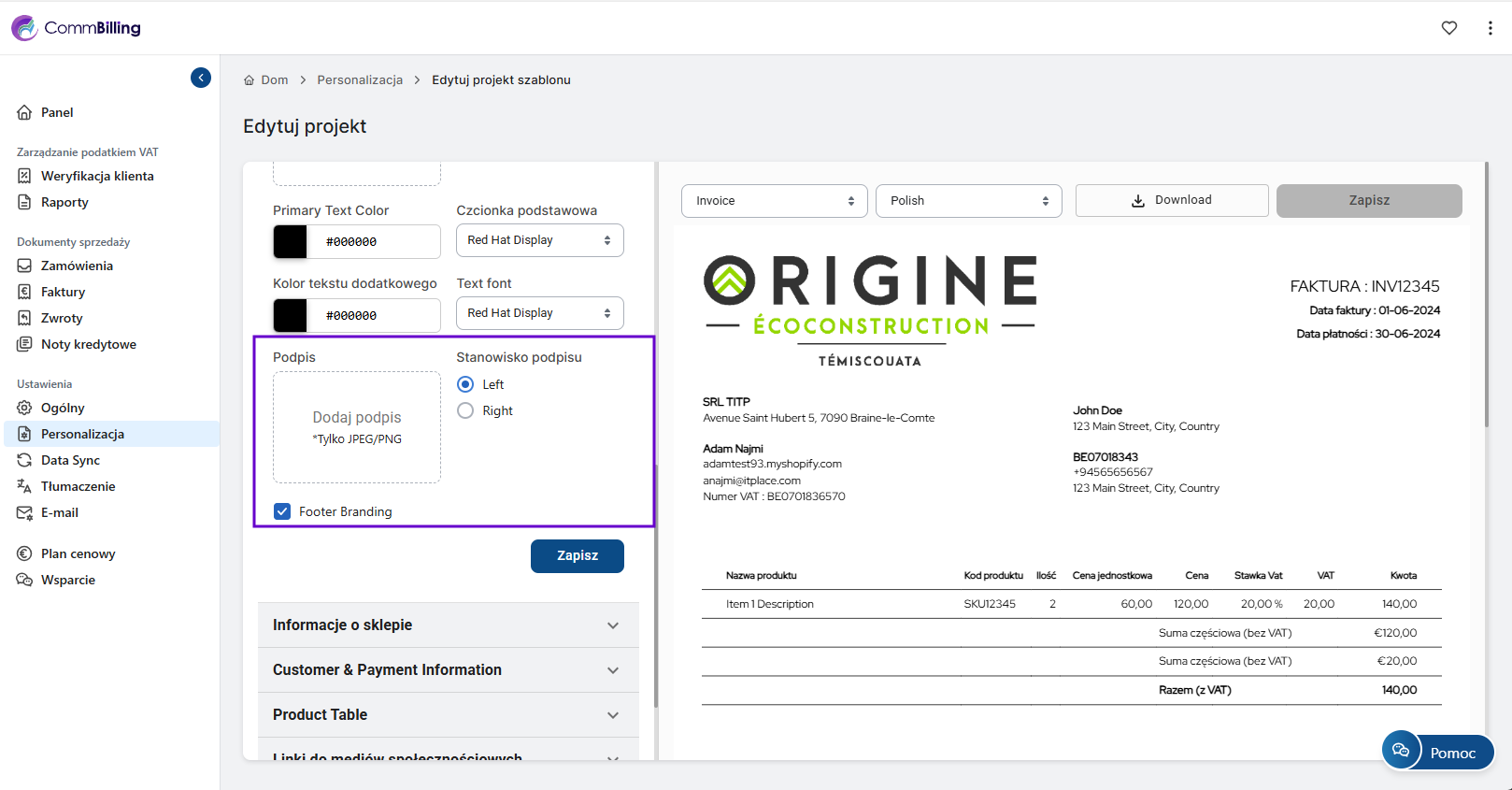 Integracja podpisu na fakturach wzmacnia profesjonalny wizerunek firmy i zwiększa zaufanie klientów do Twojej marki. Dzięki tej prostej konfiguracji CommBilling zapewnia że każda wysłana faktura odzwierciedla wiarygodność Twojej firmy oraz jej zaangażowanie w wysoką jakość komunikacji.