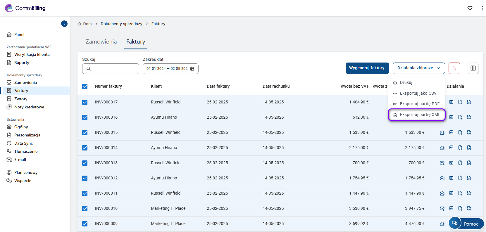 Eksportowanie faktur jako XML to zaawansowana funkcja dla firm, które potrzebują zintegrować dane faktur z innymi systemami lub spełnić określone wymogi regulacyjne. Ta funkcja jest dostępna wyłącznie dla użytkowników planu C-Business Plan. Pliki XML oferują ustrukturyzowany format, który można łatwo importować do oprogramowania księgowego lub finansowego. Oto, jak wyeksportować faktury w formacie partii XML:
