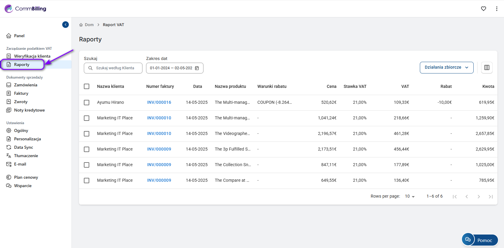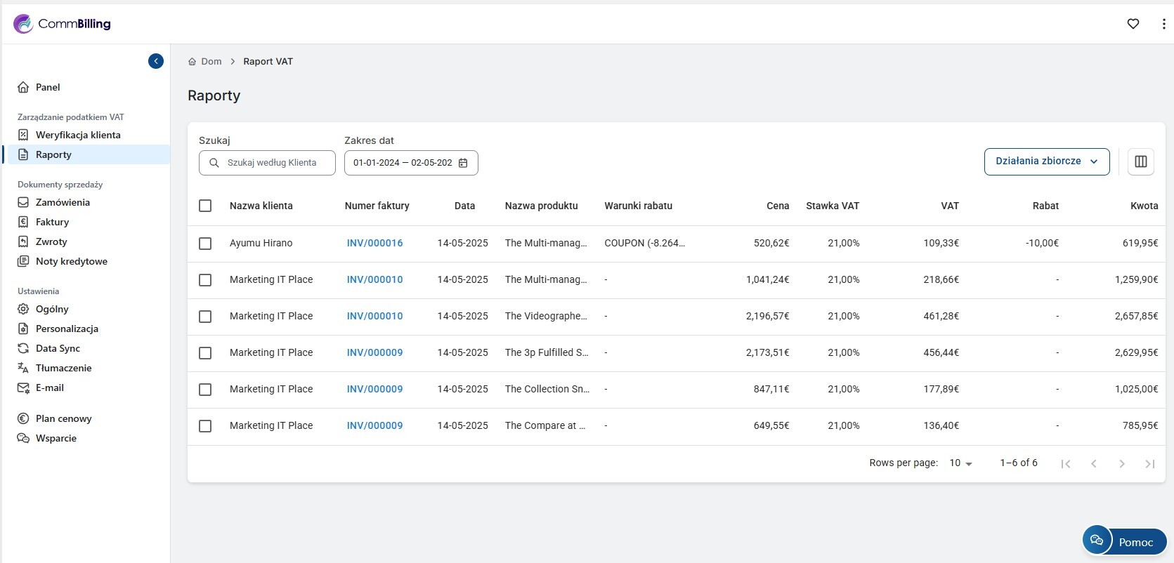 Generowanie i zarządzanie raportami VAT i podatkowymi w CommBilling jest wydajne i przyjazne dla użytkownika, dając Ci narzędzia do zachowania zgodności i organizacji. Dzięki funkcjom takim jak drukowanie zbiorcze i eksportowanie, platforma zapewnia bezproblemową obsługę danych podatkowych.