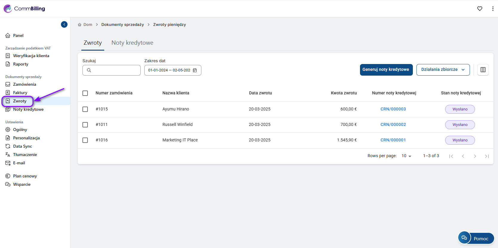 2. Otwórz CommBilling i przejdź do sekcji Dokumenty sprzedaży, a następnie do zakładki Zwroty.