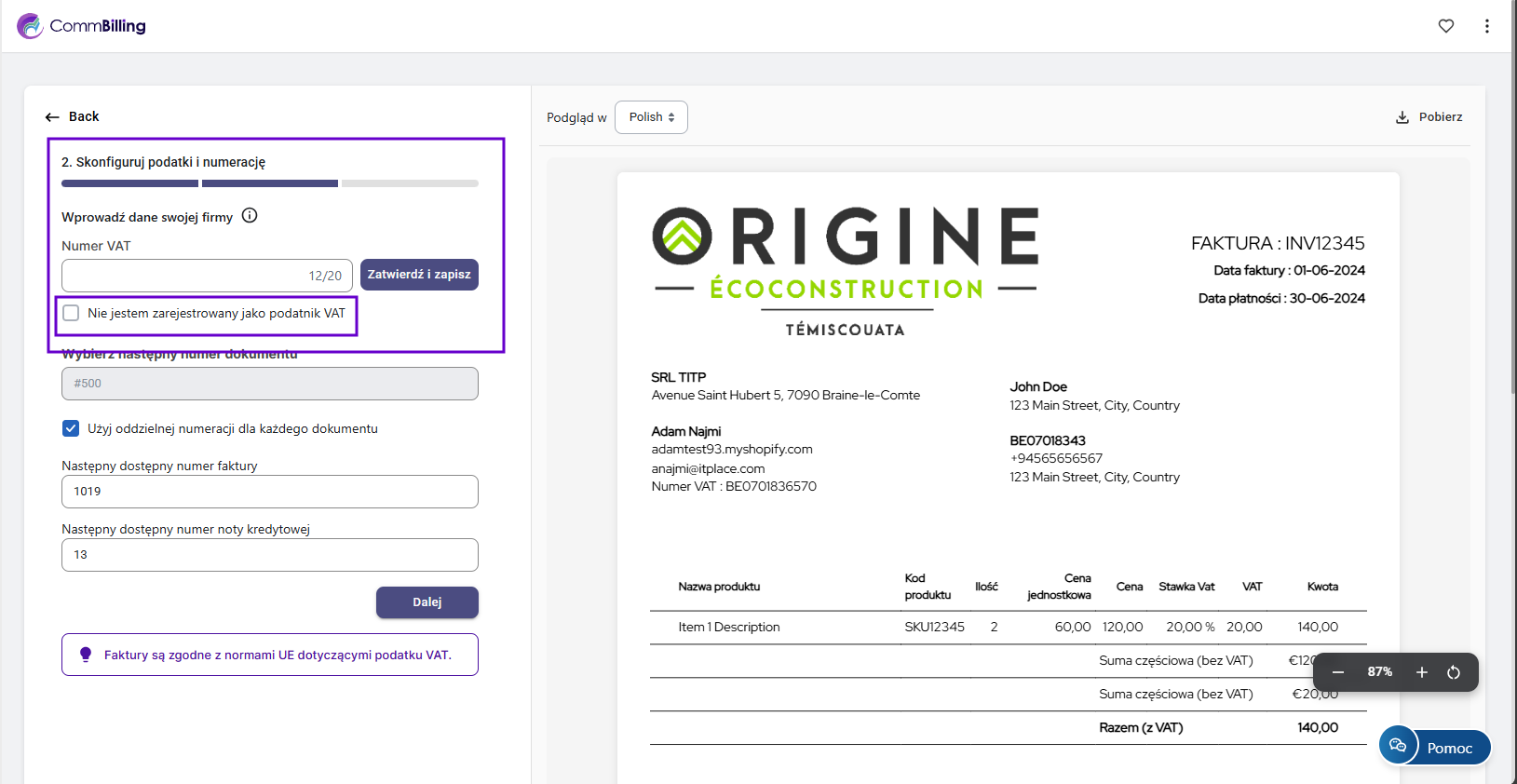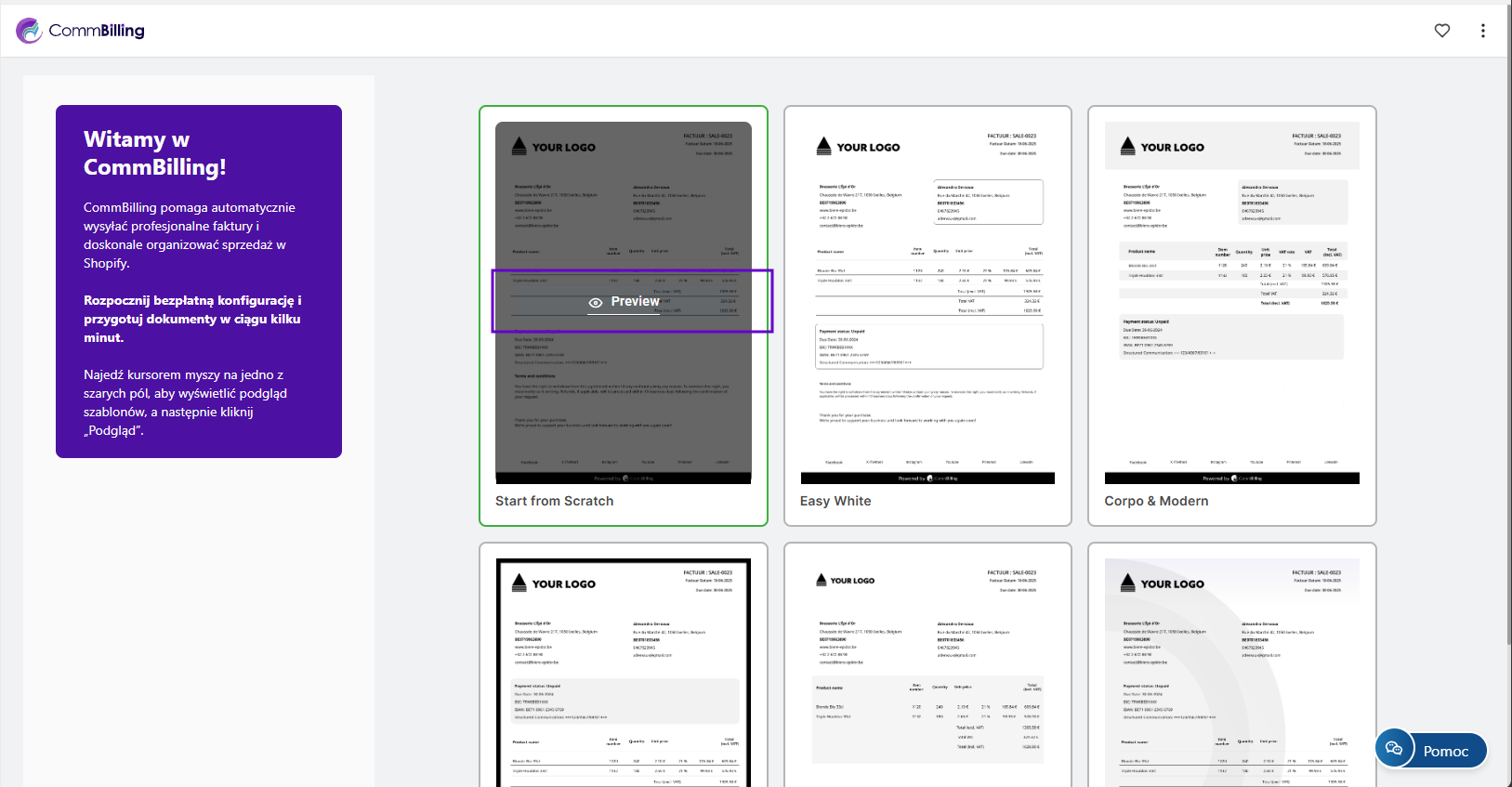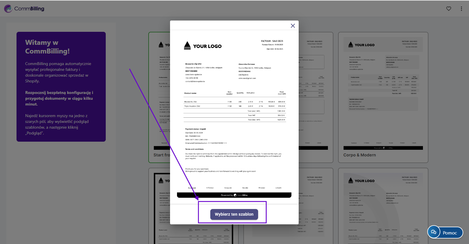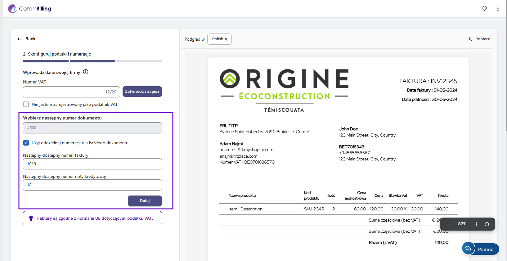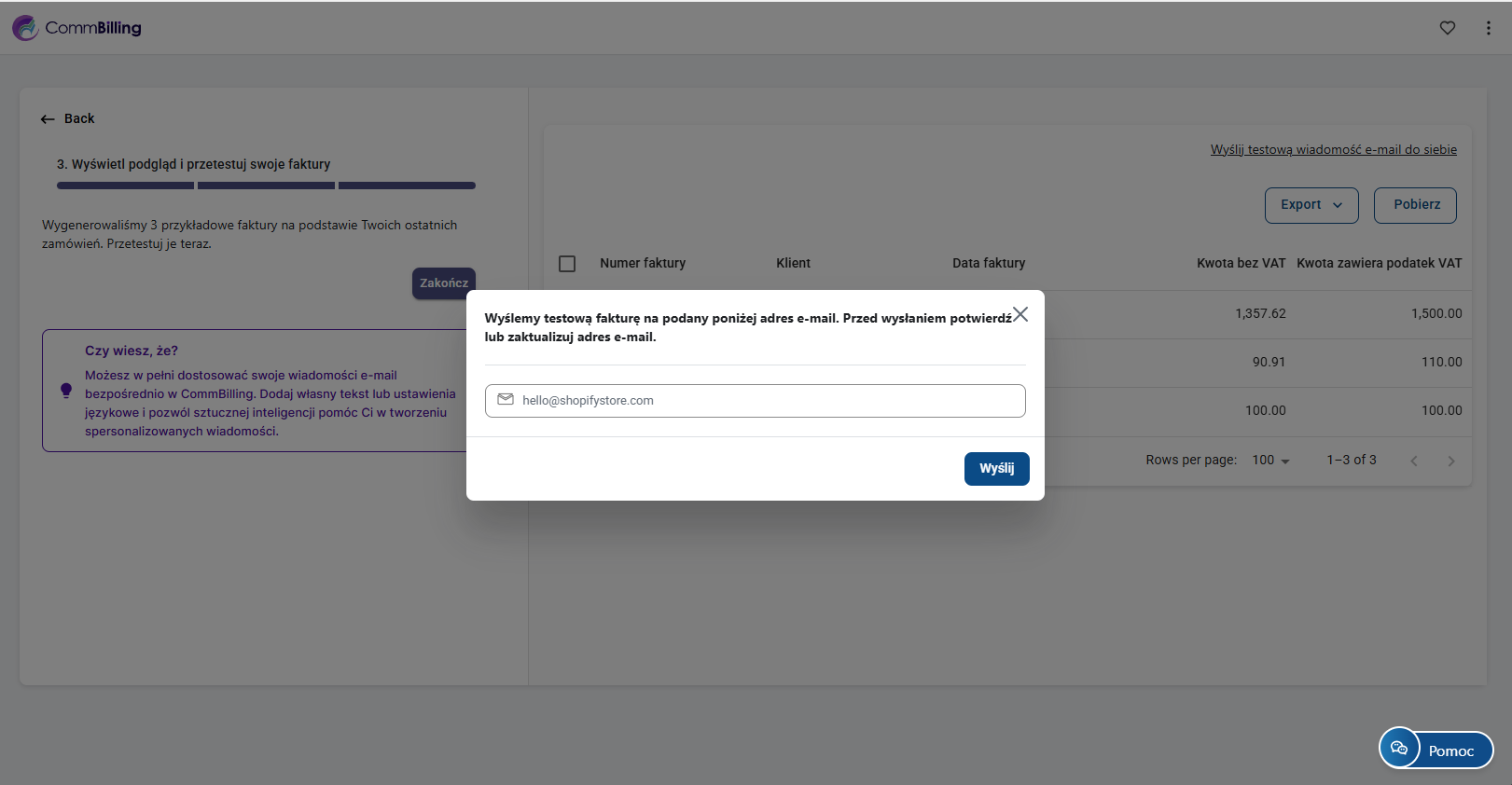 Prawidłowe skonfigurowanie CommBilling zapewnia dokładne przetwarzanie VAT, płynną synchronizację zamówień, zgodne z przepisami wystawianie faktur oraz w pełni zautomatyzowany przepływ rozliczeń. Ta początkowa konfiguracja jest kluczowa aby mieć pewność że Twoje dokumenty sprzedażowe, reguły automatyzacji i preferencje projektowe działają bezproblemowo z Twoim sklepem Shopify.