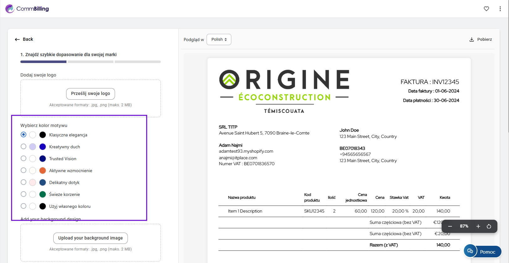 - Krok 1: Prześlij logo swojej firmy, wybierz kolor motywu i kliknij Dalej.
