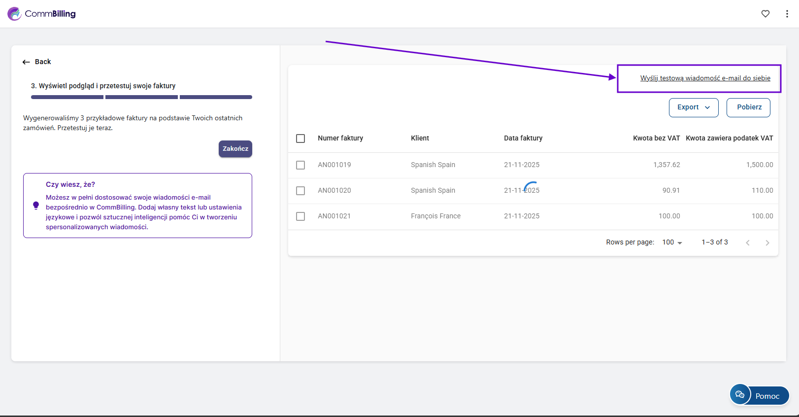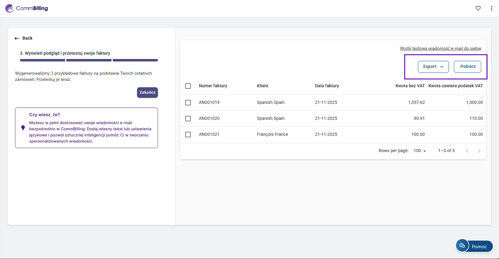 Twoja szybka konfiguracja jest teraz zakończona a aplikacja do fakturowania jest gotowa do użycia. Możesz zacząć generować faktury z dodatkową korzyścią że CommBilling automatycznie generuje trzy darmowe faktury w ramach procesu onboardingu. Dalsze dostosowania można wprowadzać w dowolnym momencie w zakładce Ustawienia.