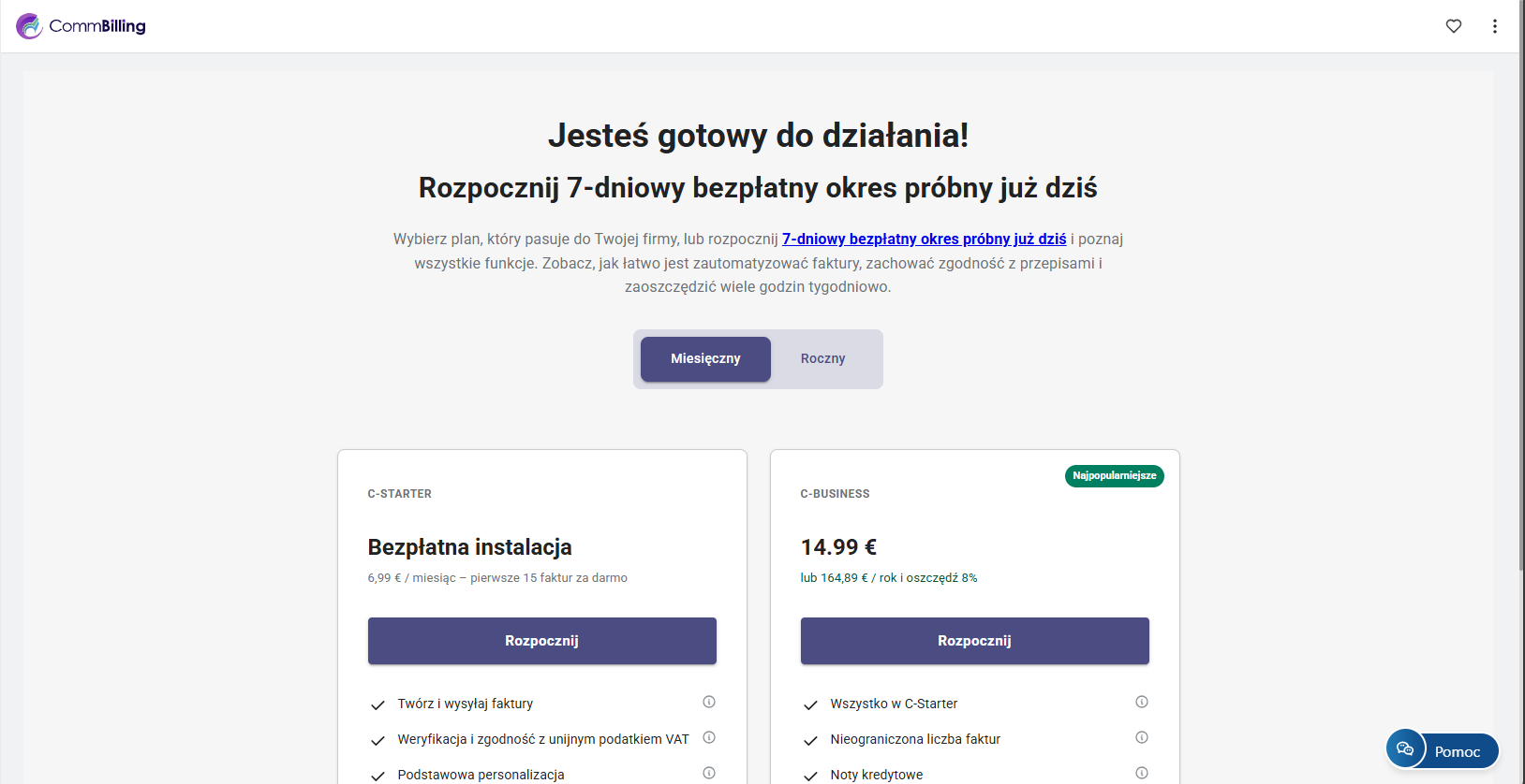 - Po zakończeniu onboardingu zostaniesz przekierowany na stronę planów cenowych. Wybór planu jest wymagany zanim rozpoczniesz korzystanie z CommBilling a siedmiodniowy okres próbny jest dostępny w obu planach.