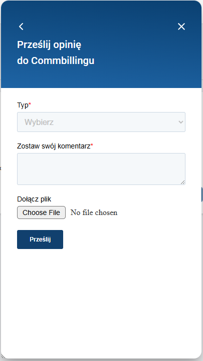 Prześlij opinię: Ta opcja umożliwia wypełnienie formularza, w którym możesz podzielić się swoimi uwagami, sugestiami lub zgłosić napotkane problemy związane z CommBilling. Jest to bezpośredni sposób komunikacji z zespołem CommBilling, który pomoże ulepszyć aplikację.