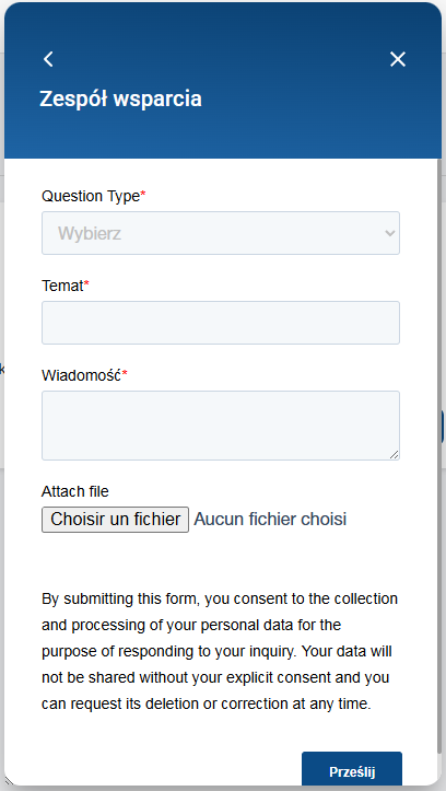 Wyślij e-mail: Jeśli preferujesz bardziej tradycyjne wsparcie, opcja Wyślij e-mail pozwala wysłać zapytanie za pomocą wiadomości e-mail. Ta metoda jest idealna do pytań lub problemów, które wymagają bardziej szczegółowych odpowiedzi lub załączników. Zespół wsparcia zobowiązuje się do odpowiedzi w ciągu 24 godzin roboczych, zapewniając szybkie wsparcie w przypadku zapytań.