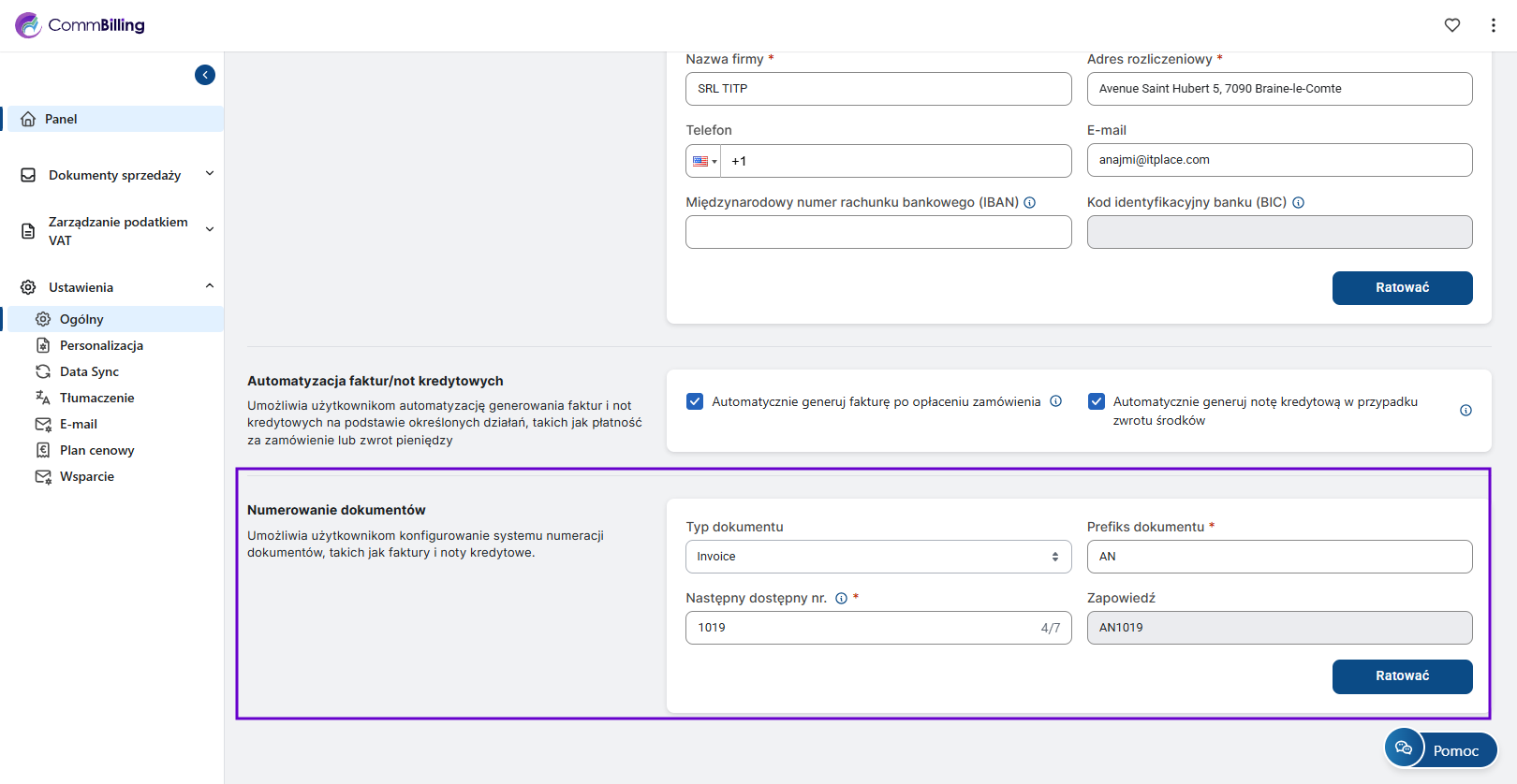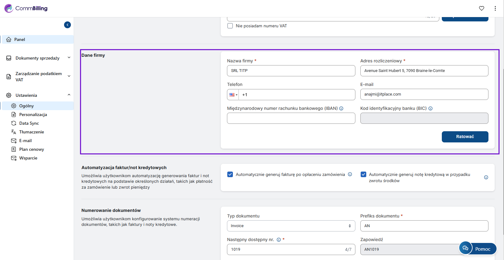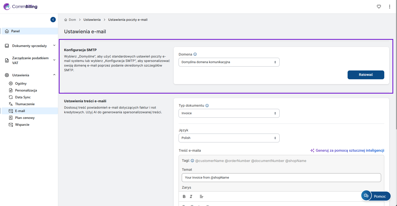 Konfiguracja SMTP: W zależności od planu można korzystać z serwera SMTP CommBilling lub skonfigurować własny, uzyskując pełną kontrolę nad wysyłką faktur i innych dokumentów.