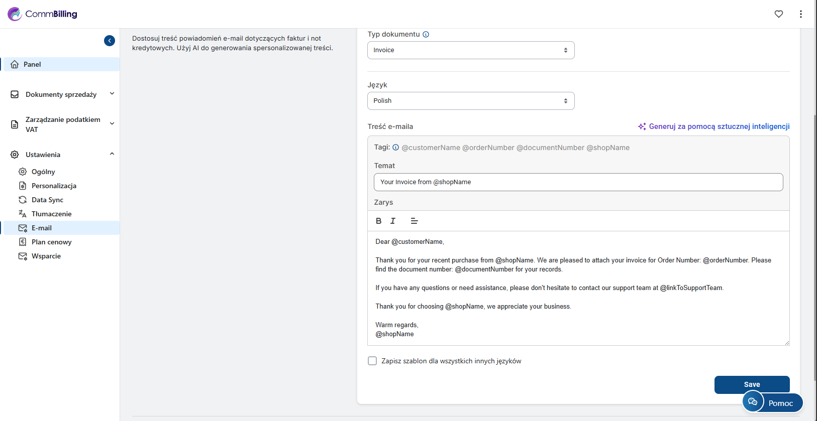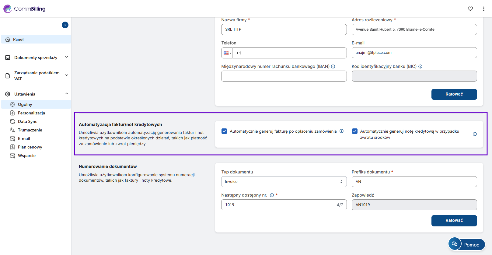 Automatyczne generowanie faktur: Włączenie tej opcji sprawia, że CommBilling automatycznie tworzy faktury dla każdego zamówienia w Shopify.