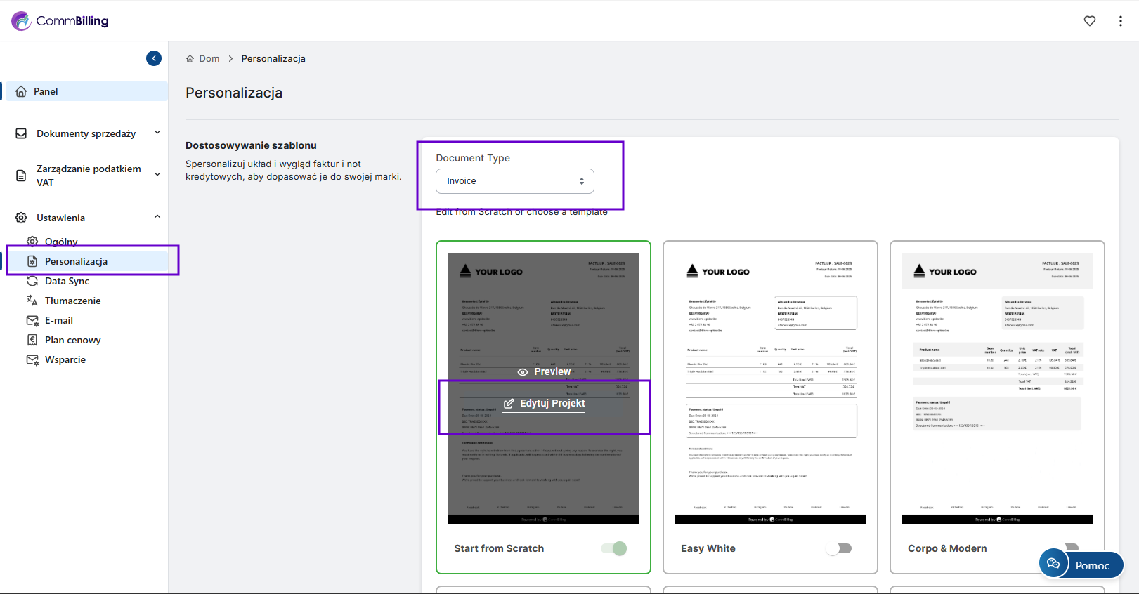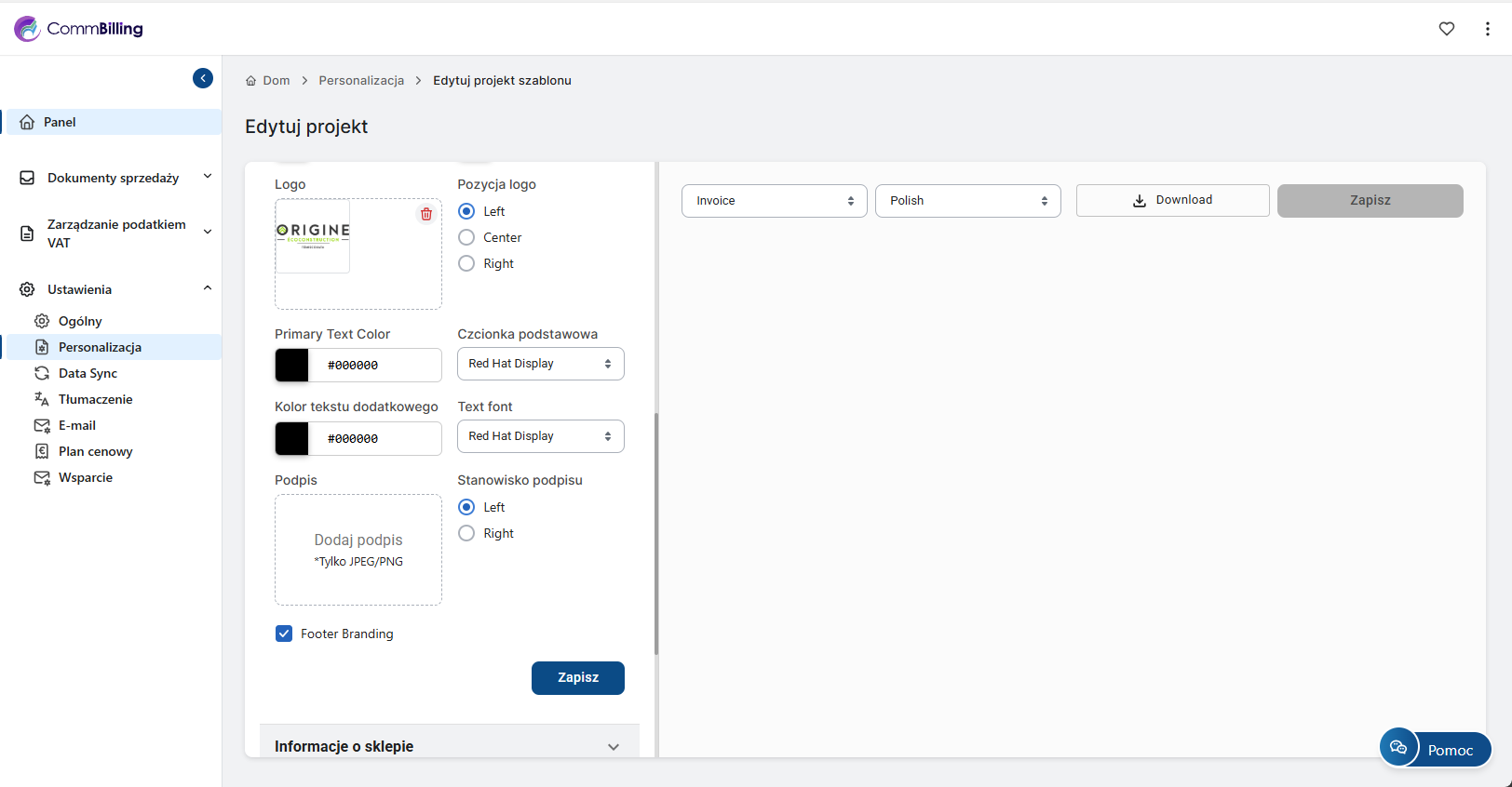 - Projekt dokumentów sprzedaży: W zależności od Twojego planu subskrypcji, możesz w pełni lub częściowo dostosować wygląd faktur i not korygujących, w tym dodać logo Twojego sklepu, wybrać schematy kolorów oraz dodać wszelkie dodatkowe informacje, takie jak warunki, usunąć branding CommBilling itp.