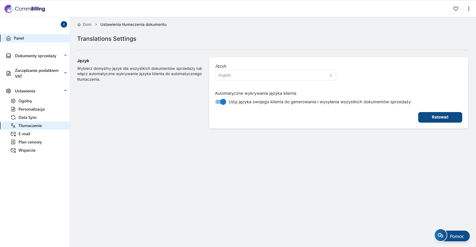 W podzakładce Tłumaczenie CommBilling wykrywa język używany w Twoim sklepie Shopify i odpowiednio dostosowuje interfejs. W razie potrzeby możesz ręcznie zmienić ustawienia językowe.