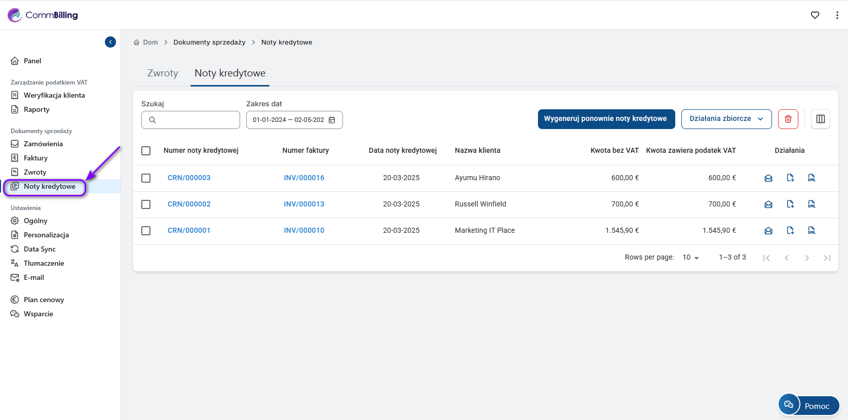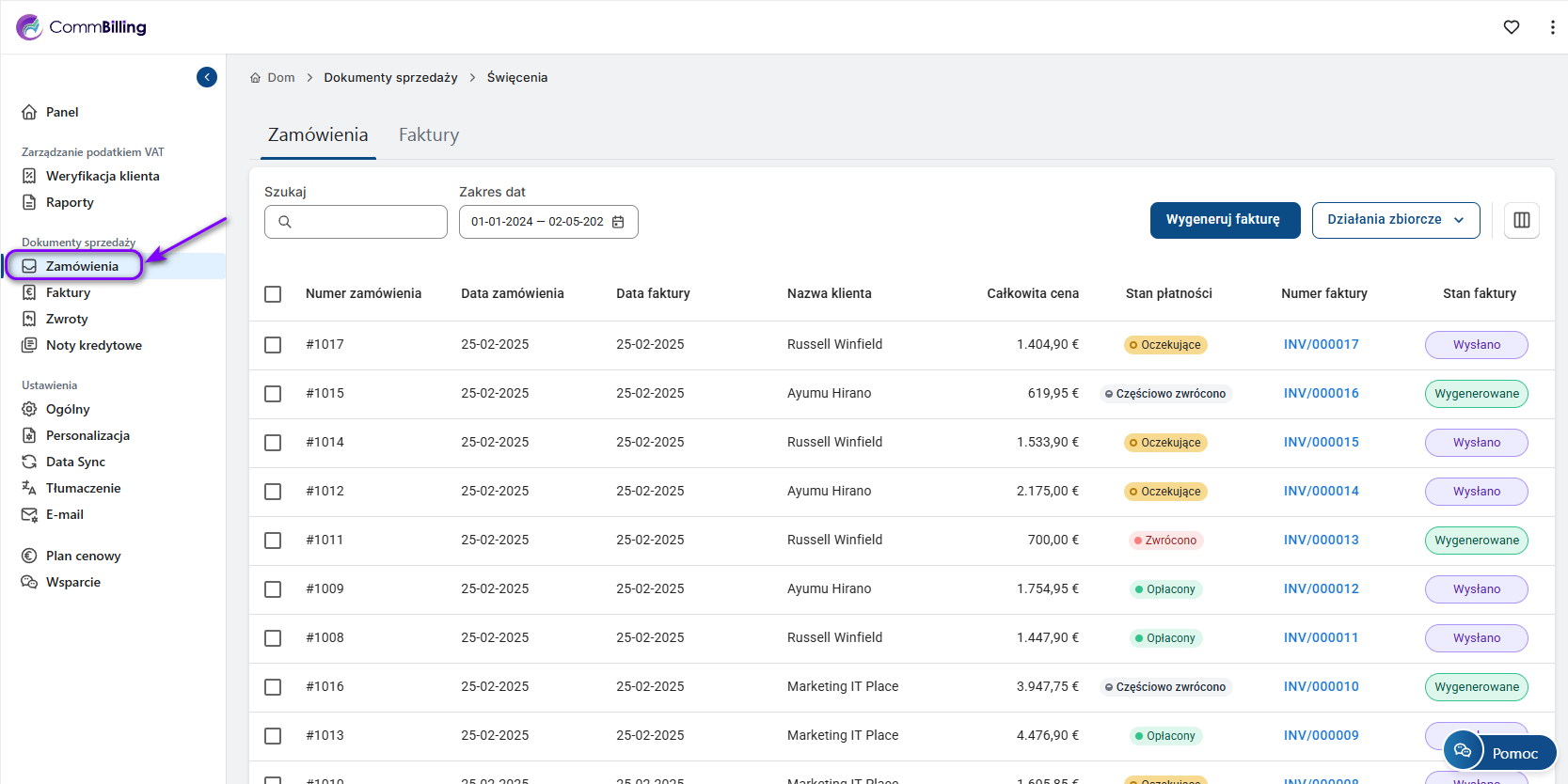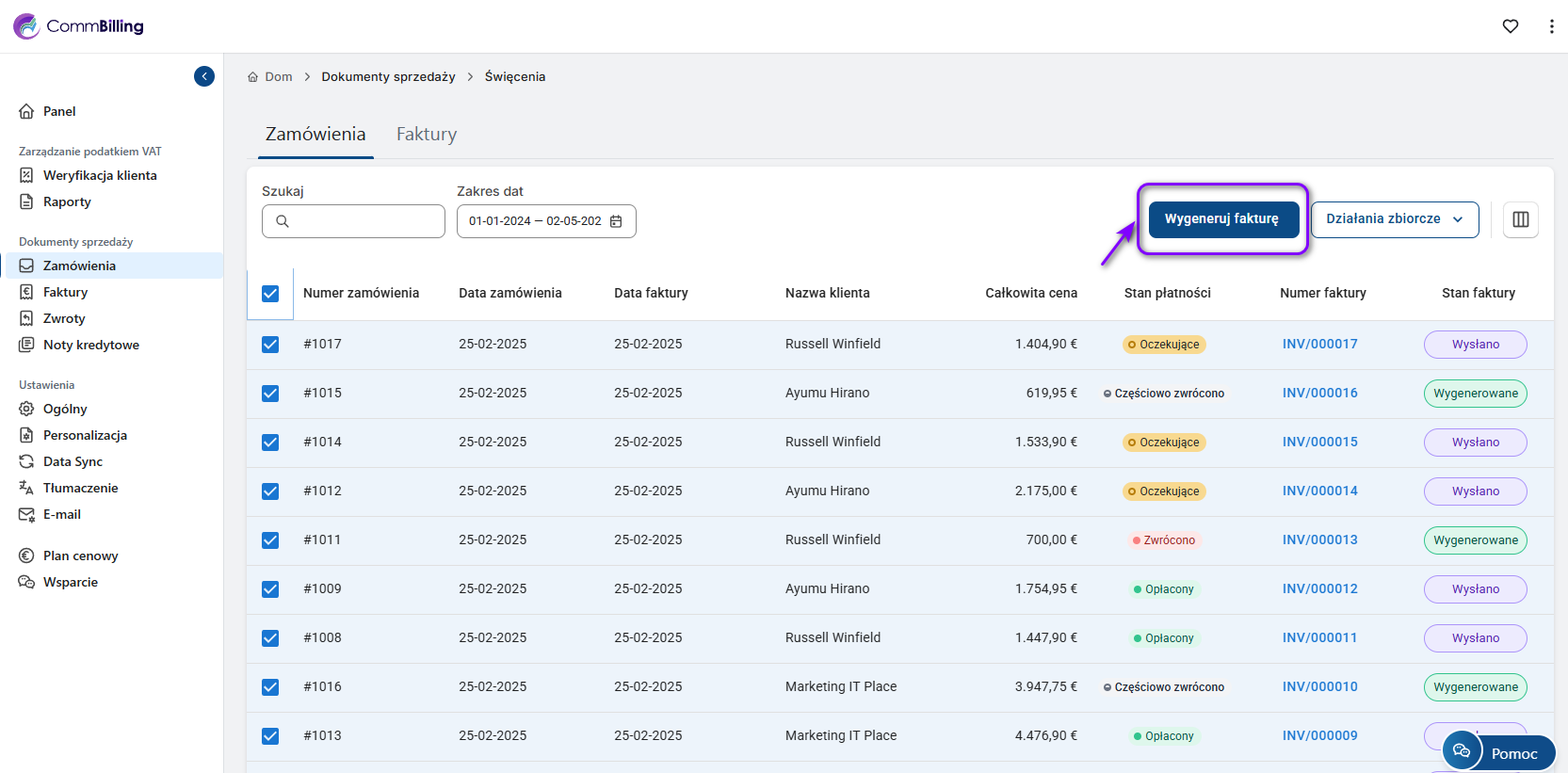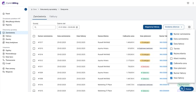 Sekcja Dokumenty sprzedaży w CommBilling to centralne miejsce do zarządzania wszystkimi zamówieniami, fakturami, zwrotami i notami kredytowymi. Dostępne podzakładki zależą od wybranego planu: