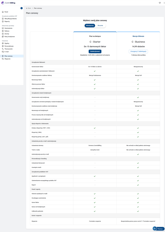 Karta Plan cenowy to twoje centralne miejsce do wyboru i zarządzania subskrypcją. Dzięki siedmiodniowemu darmowemu okresowi próbnym dostępnemu w obu planach możesz z pewnością eksplorować CommBilling i wybrać plan który najlepiej wspiera twój proces fakturowania i rozwój firmy.