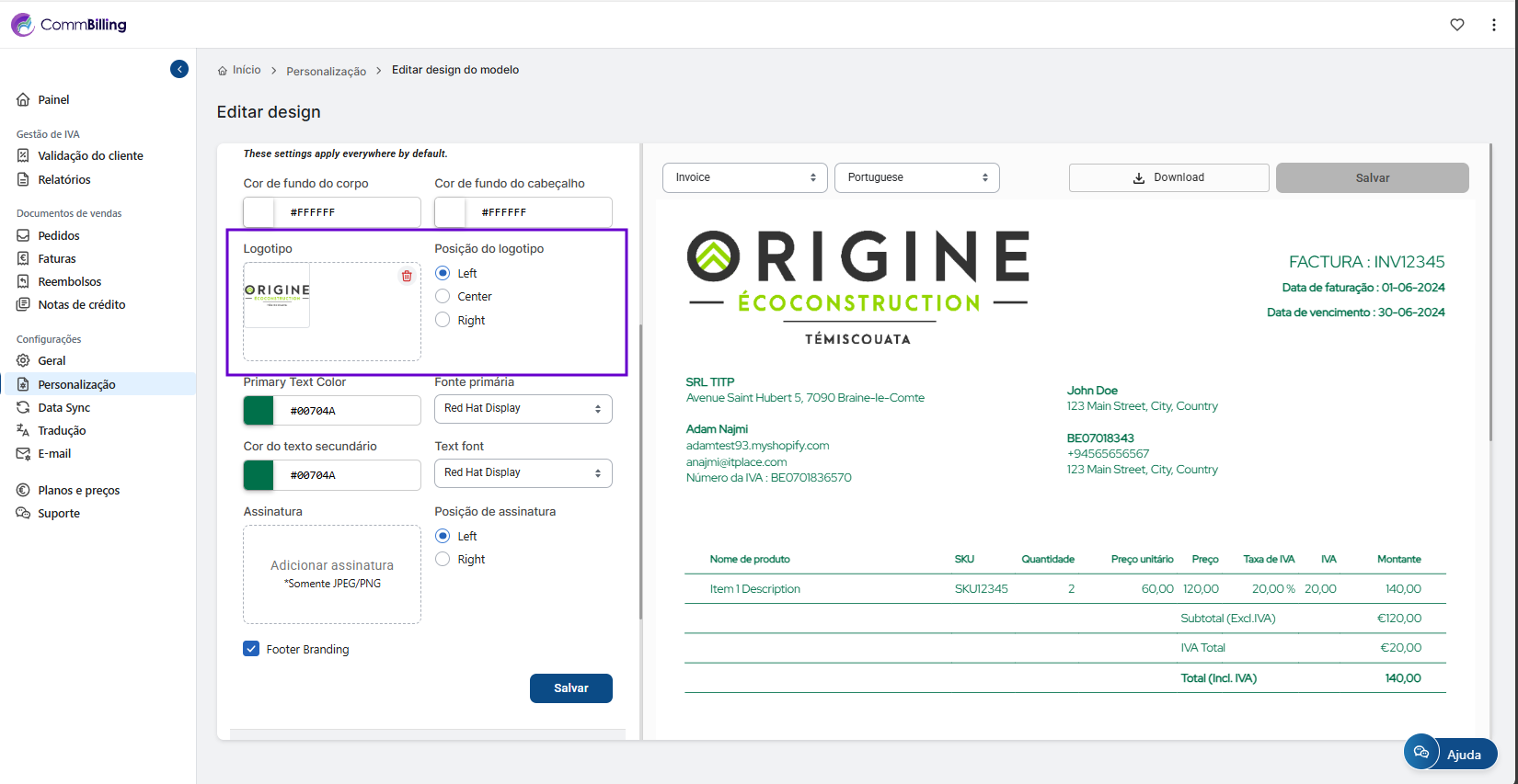 Ao adicionar o seu logótipo, garante que cada fatura enviada a partir do CommBilling é imediatamente reconhecível e consistente com a identidade visual da sua empresa. Esta personalização pequena mas impactante reforça a credibilidade da sua marca e melhora a experiência de comunicação com os seus clientes.