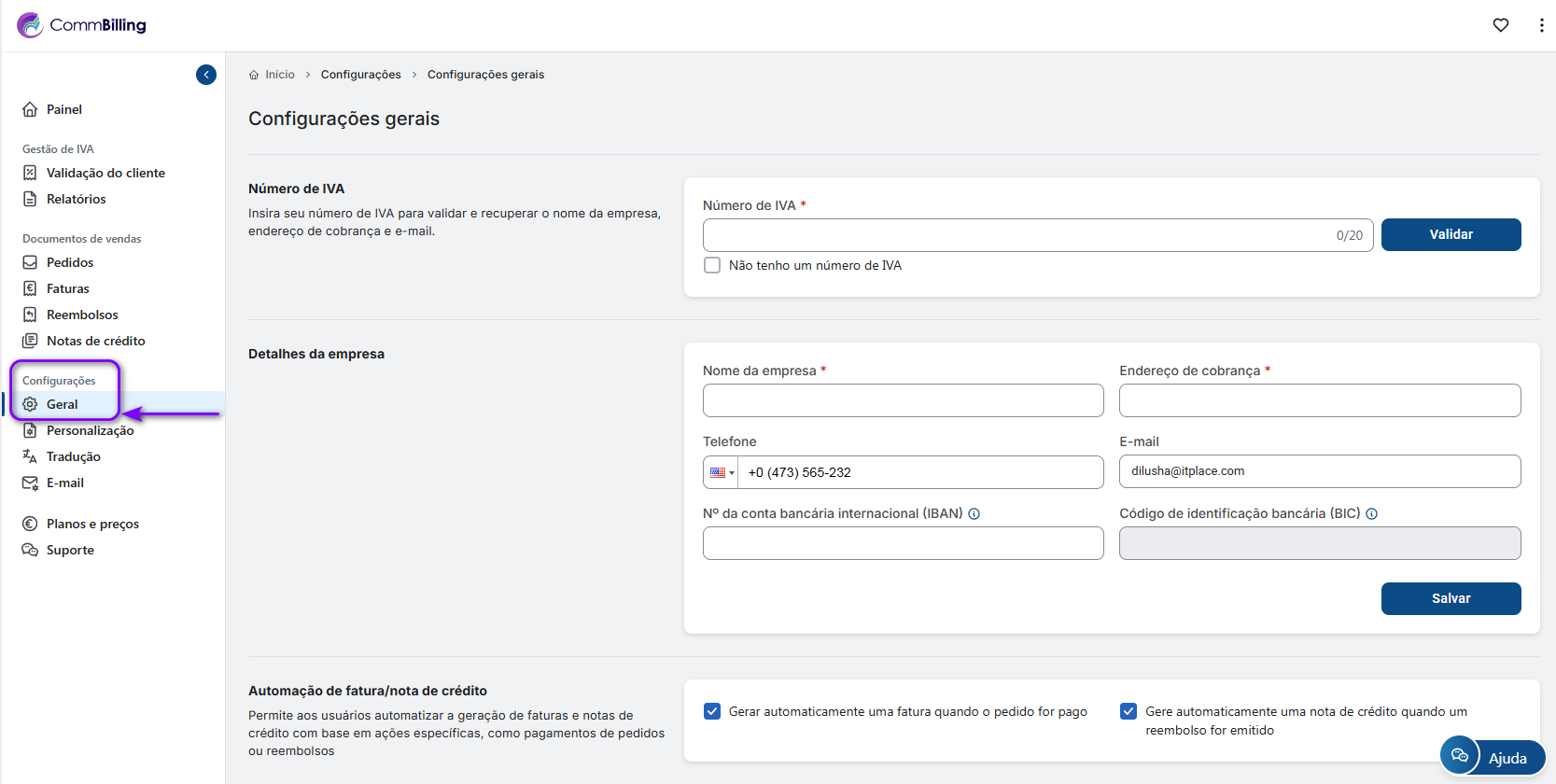 - Passo 3: Desloque-se para baixo até à secção Automação de Faturas e Notas de Crédito.